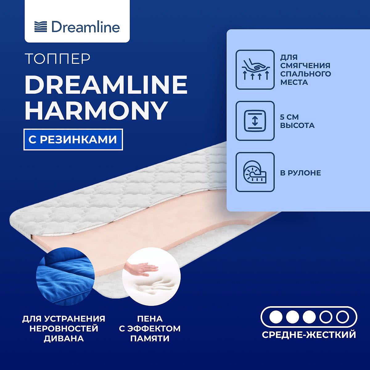 Матрас «DreamLine Harmony» — средней жесткости, которая подходит большинству людей среднего телосложения. Это — универсальный выбор и детям, и взрослым, и пожилым людям.