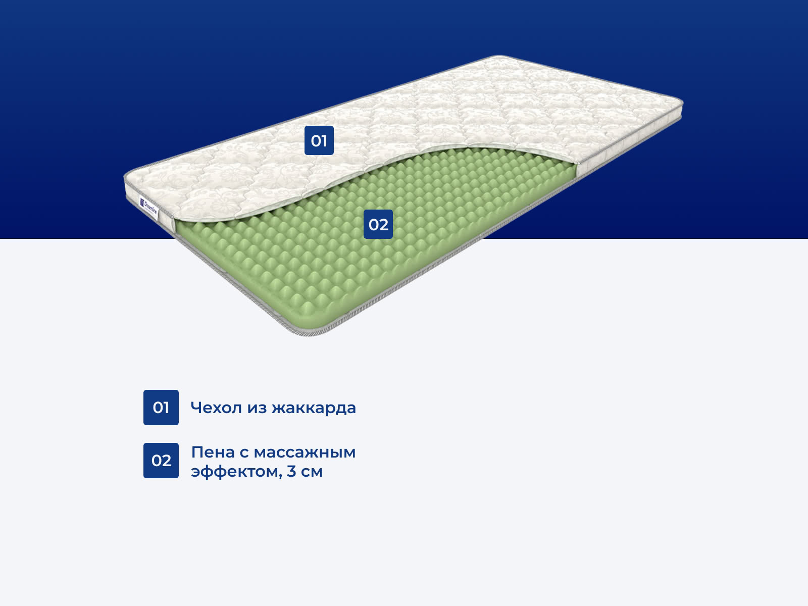 Жесткость: ниже средней.Состав: пена Ergo Foam с массажной поверхностью. Несъемный чехол Cotton: хлопковый жаккард (60% хлопок, 40% ПЭ), простеганный на холконе плотностью 100 г/м2. Высота, см: 5. Крепление: резинки по углам. Матрас поставляется в скрученном виде.