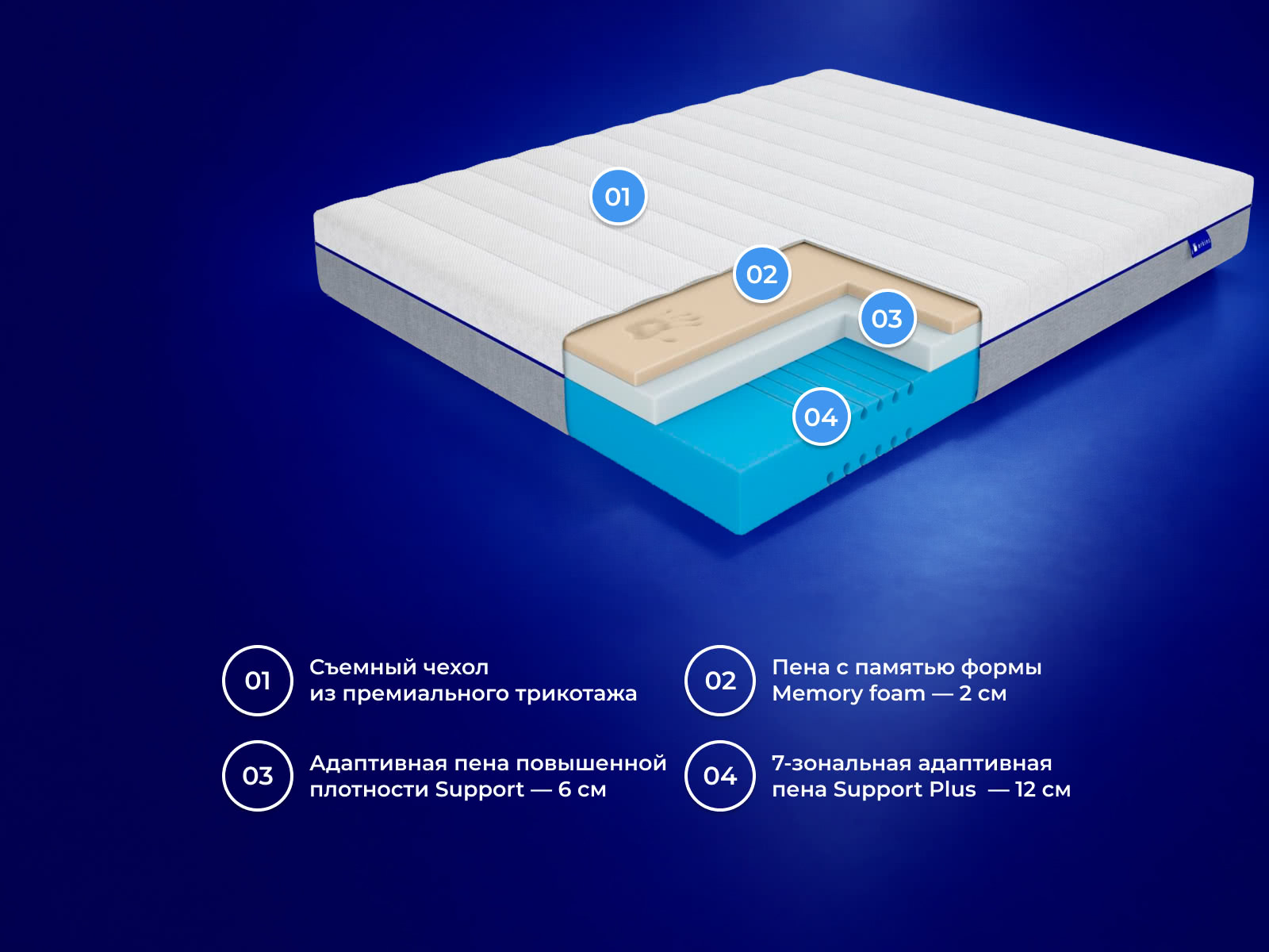 Сверхкомфортный беспружинный матрас на основе уникальной 7-ми зональной пены Support Plus и пены с эффектом памяти Memory Foam.Матрас Simple — это идеальное сочетание комфорта и высокой анатомической поддержки. С матрасом Simple выбор матраса станет простым! Семь зон обеспечивают комфортный сон за счет быстрой адаптации матраса под изгибы тела. В местах повышенного давления на матрас пена представлена в виде крупной волновой резки, что обеспечивает большую упругость зон матраса для поддержки плеч, бедер и ног. Остальные зоны выполнены из пены с мелкой волновой резкой для более деликатной поддержки. Такое зональное деление позволяет равномерно распределить нагрузку и снять мышечное напряжение и обеспечить анатомически правильное положение во время отдыха и сна. Профилированная поверхность пены обеспечивает хорошую вентиляцию внутри матраса, что позволяет эффективно отводить излишнее тепло, а значит спать на таком матрасе более комфортно. Пена с эффектом памяти Memory foam обеспечит высокий уровень комфортности, не оказывая ответного давления на мягкие ткани тела. С матрасом Simple Вы почувствуете сон, как на нежном облачке с высокой поддержкой. Съемный чехол выполнен из премиального трикотажа, простеганного на гипоаллергенном волокне Filler touсh, что обеспечивает дополнительный комфорт и нежность при прикосновении. Бурлет чехла выполнен из высокопрочного мебельного трикотажа и защитит матрас от истирания, продлевая его срок службы. Все составляющие матраса Erkins Simple не вызывают аллергии и подходят людям с гиперчувствительной кожей. Односторонний матрас средней жесткости. Состав матраса: