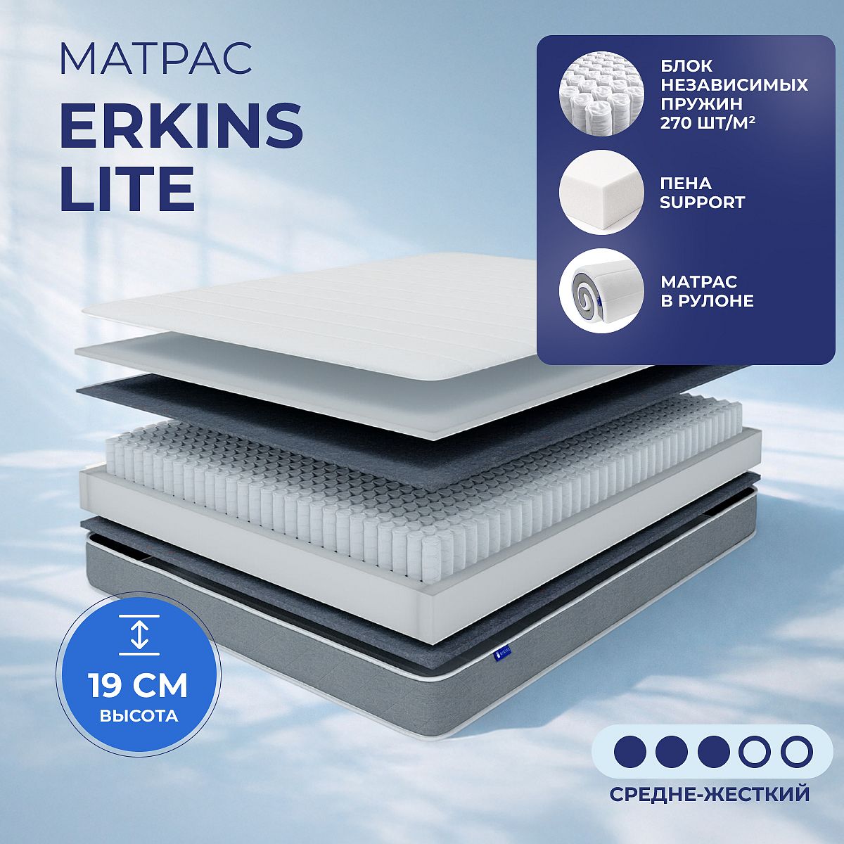 Матрас «Erkins Lite» — средней жесткости, которая подходит большинству людей среднего телосложения. Это — универсальный выбор и детям, и взрослым, и пожилым людям.