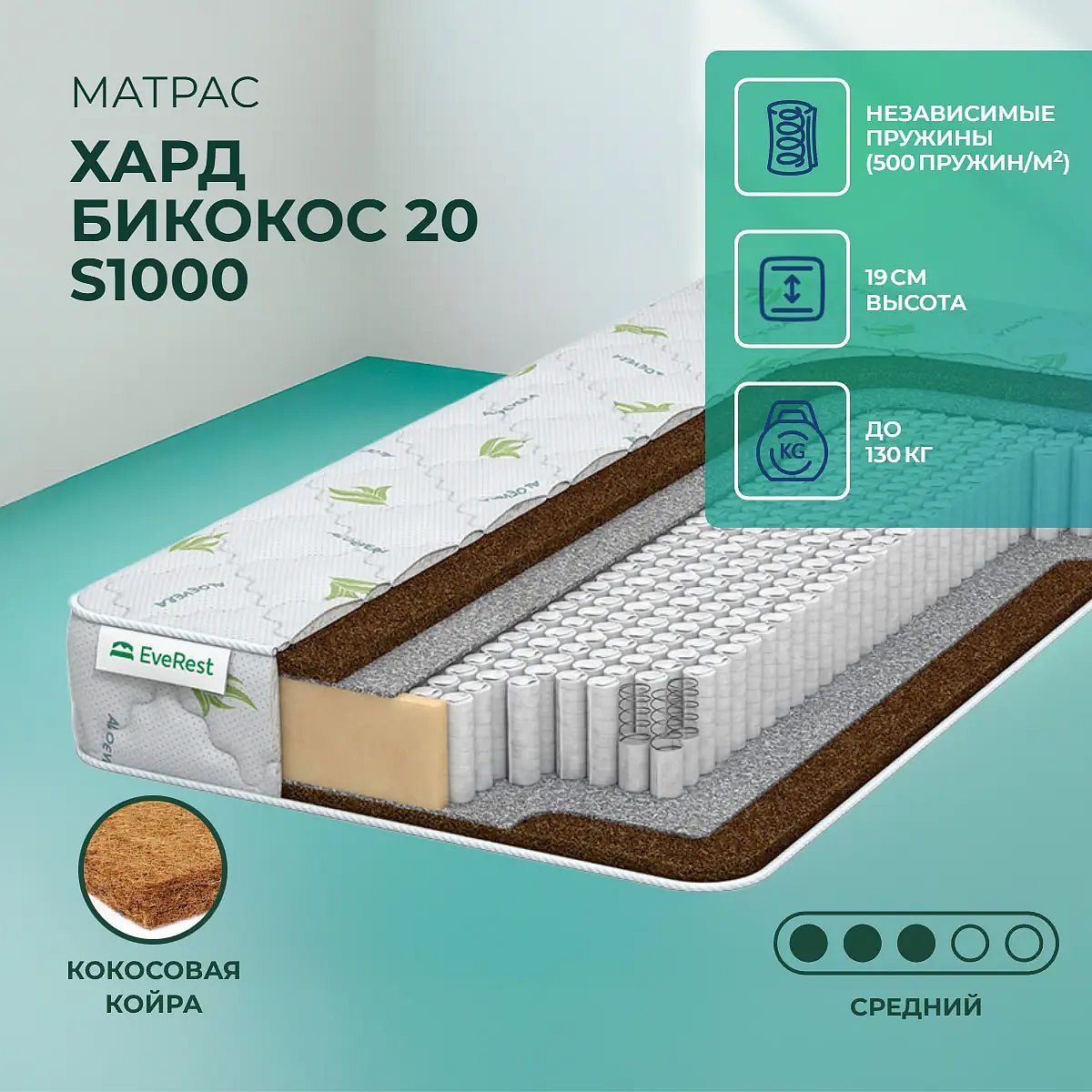 Матрас «EveRest Хард Бикокос 20 S1000» — средней жесткости, которая комфортна большинству людей среднего телосложения. Это — универсальный вариант и детям, и взрослым, и пожилым людям.