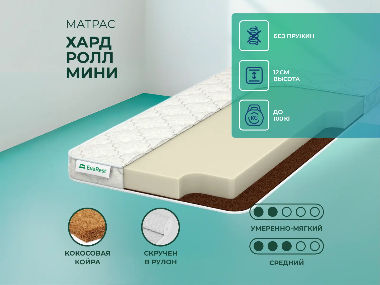 Матрас Хард Ролл Мини рассчитан на нагрузку не более 100 кг на одно спальное место.