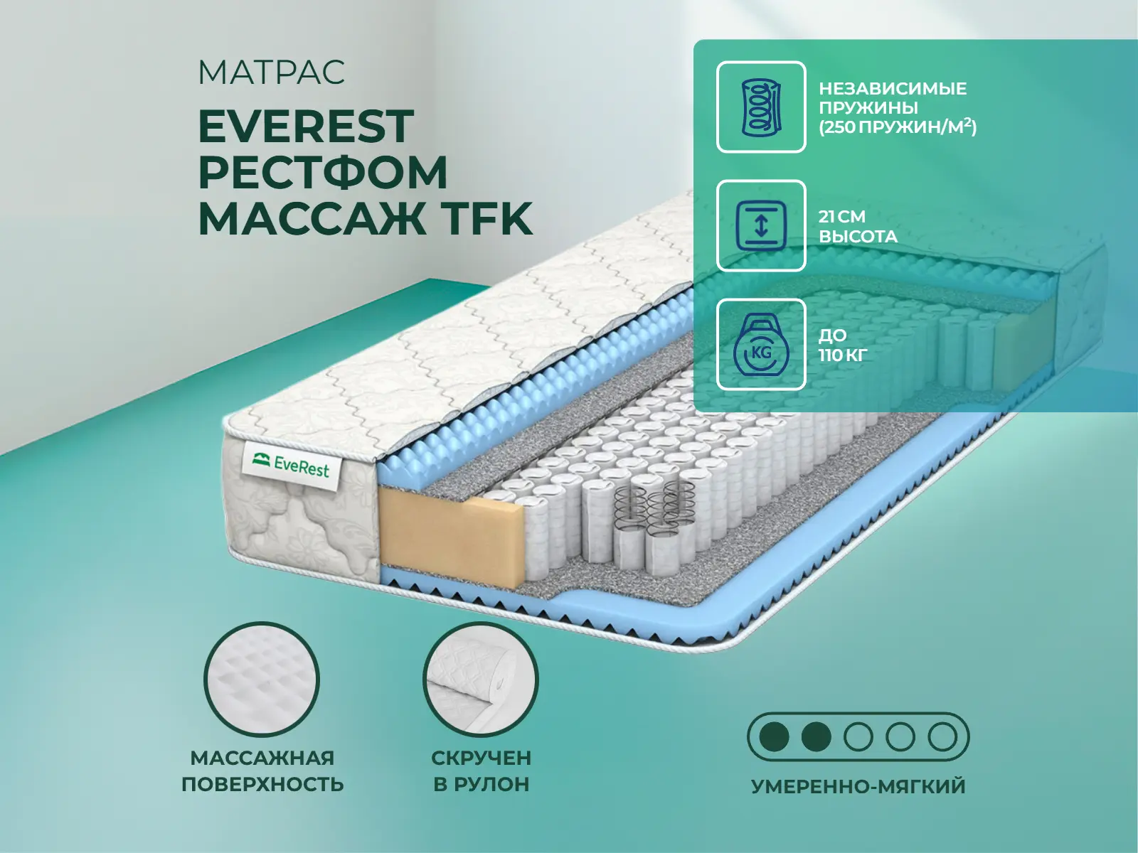 Средне-мягкий матрас «EveRest Рестфом массаж TFK» — для истинного ценителя комфорта. Такая модель хорошо подойдет людям с небольшим весом.