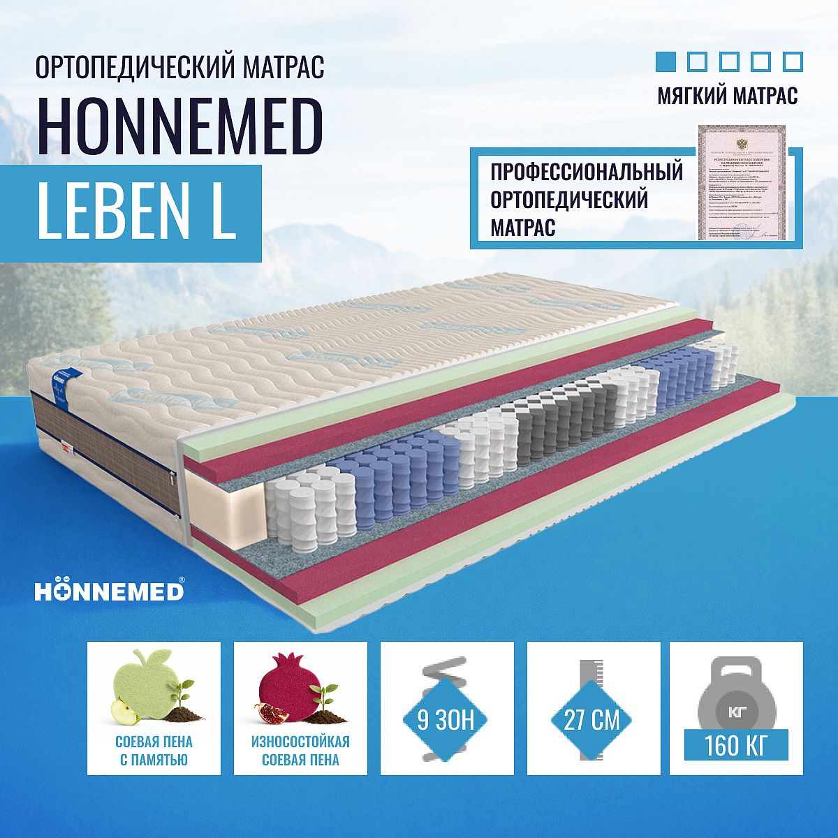 Ортопедические свойства матраса «ортопедический матрас Honnemed Leben L» подтверждены — матрас сертифицирован как медицинское изделие. Матрас будет полезен для правильной поддержки позвоночника и профилактики нарушений опорно-двигательного аппарата.
