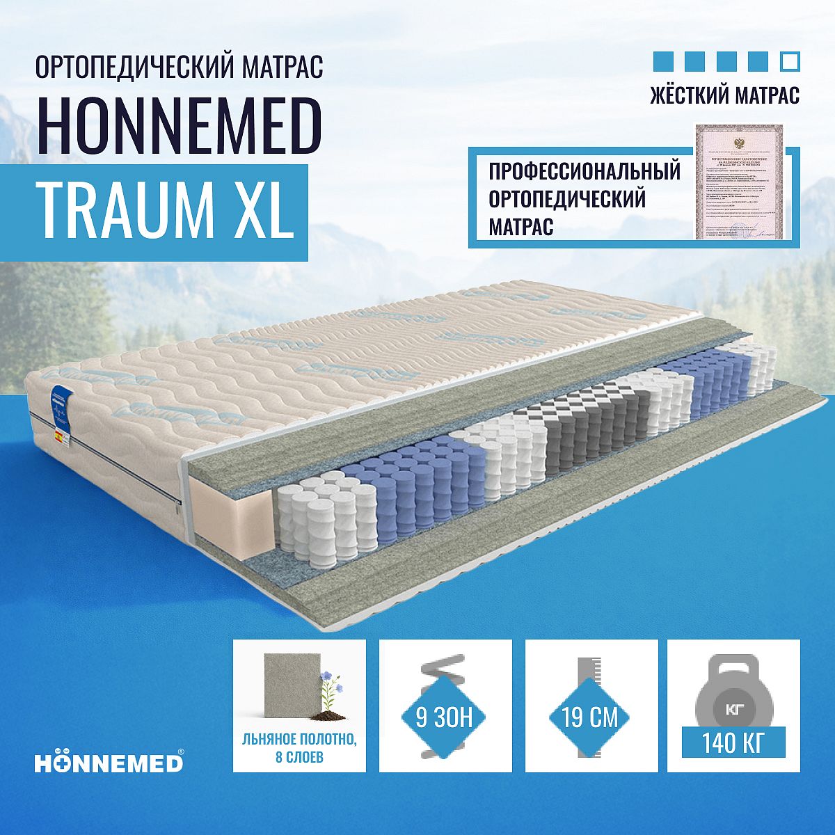Ортопедические свойства матраса «ортопедический матрас Honnemed Traum XL» подтверждены — матрас сертифицирован как медицинское изделие. Матрас будет полезен для правильной поддержки позвоночника и профилактики нарушений опорно-двигательного аппарата.