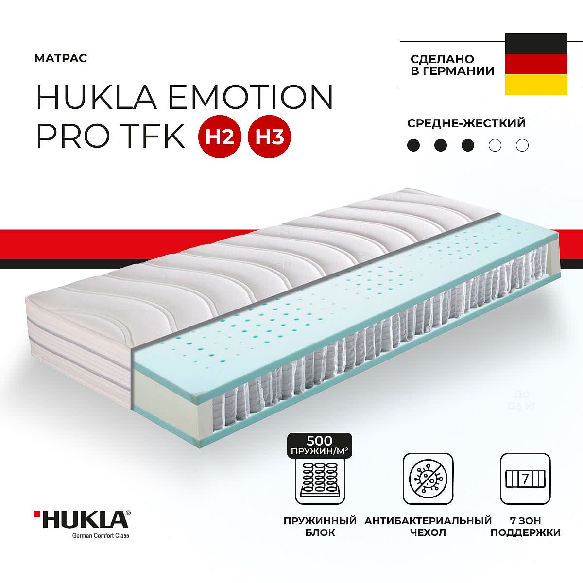 Матрас «HUKLA Emotion Pro TFK» — средней жесткости, которая комфортна большинству людей среднего телосложения. Это — оптимальный вариант и детям, и взрослым, и пожилым людям.