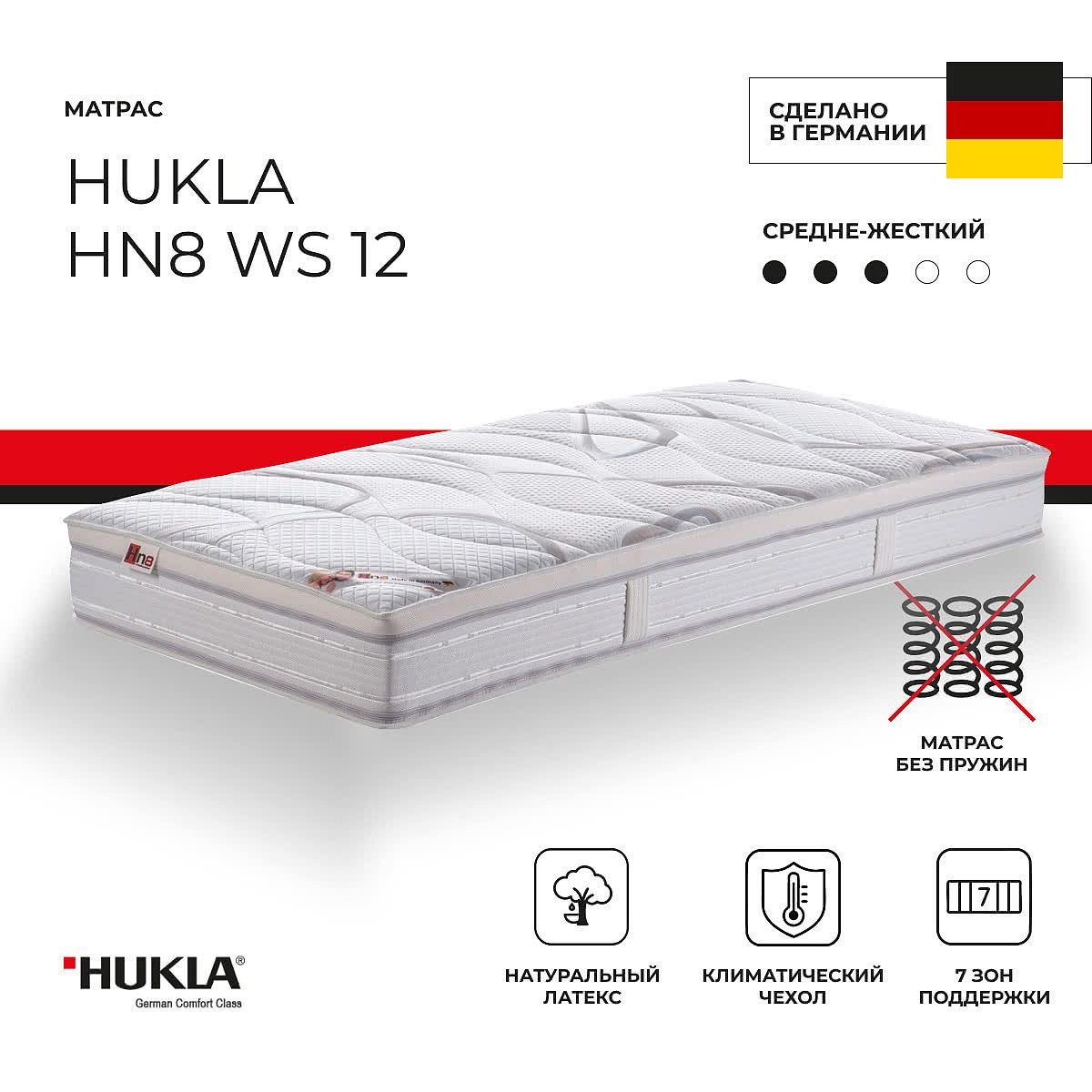 Матрас «HUKLA Hn8 WS 12» — средней жесткости, которая комфортна большинству людей среднего телосложения. Это — универсальный выбор и детям, и взрослым, и пожилым людям.