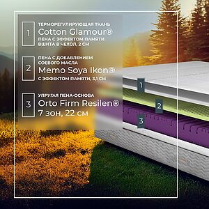 Точно рассчитанная комбинация двух слоёв разного комфорта и деление блока на зоны поддержки делают этот матрас универсальным и подходящим по своим анатомическим свойствам большинству пользователей.Верхний слой матрасного блока Memo Soya Ikon с добавлением соевого масла обладает эффектом памяти, отлично дышит и самое главное – обеспечивает высокий анатомический эффект, практически снимая обратное давление на тело человека со стороны матраса. Дополнительно он профилирован с помощью технологии волновой резки, за счёт чего создаётся лёгкий массажный эффект и улучшает воздухообмен. Несущий нижний слой материала основы с высокой компрессионной устойчивостью, в сочетании с верхними мягкими анатомическими слоями, создаёт идеальную поддержку спины с высоким уровнем комфорта. Деление нижнего блока на анатомические придаёт матрасу оптимальную эргономику и адаптацию матраса в местах значительных весовых нагрузок. Состав матраса: