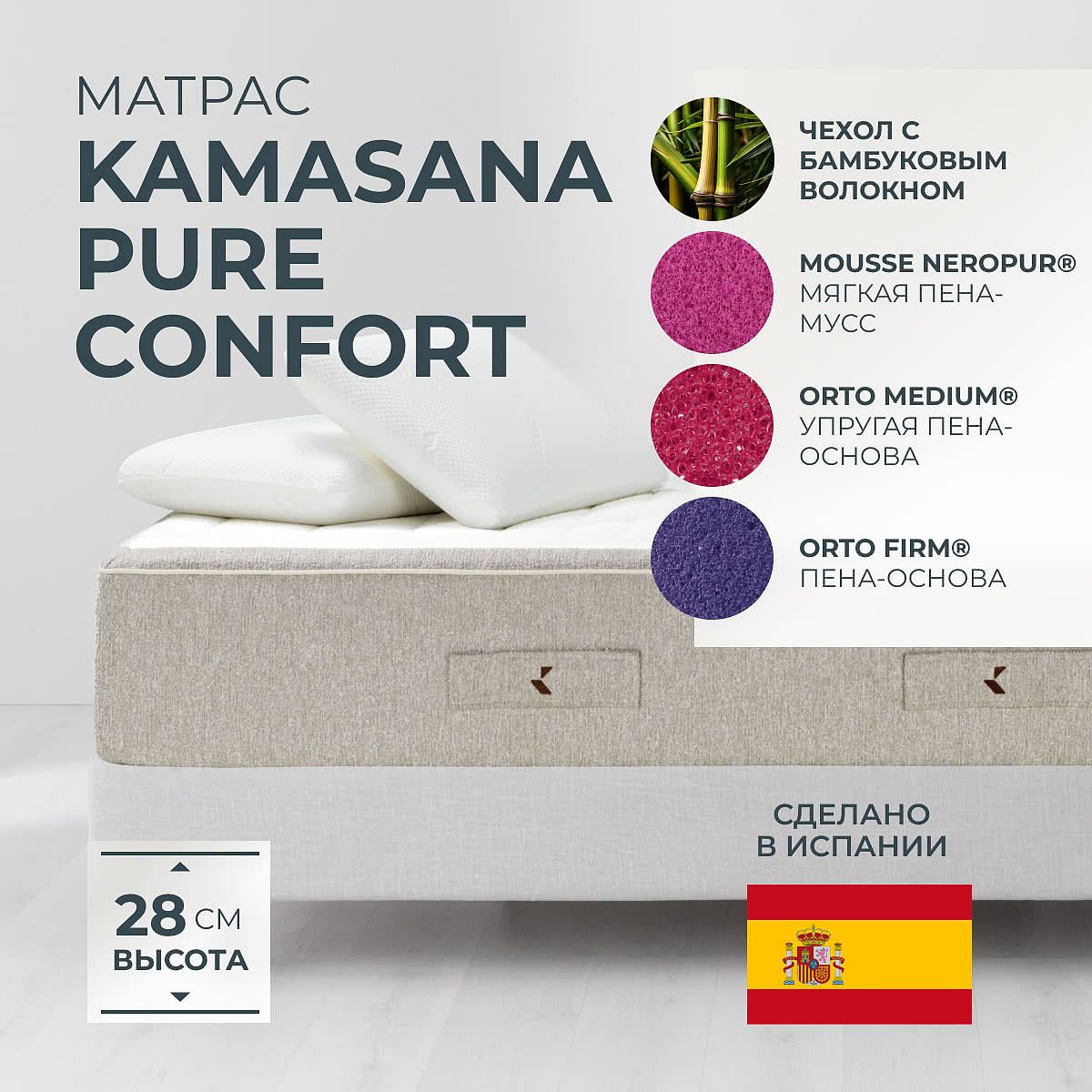 Матрас «Kamasana Pure Confort» — средней жесткости, которая подходит большинству людей среднего телосложения. Это — универсальный выбор и детям, и взрослым, и пожилым людям.