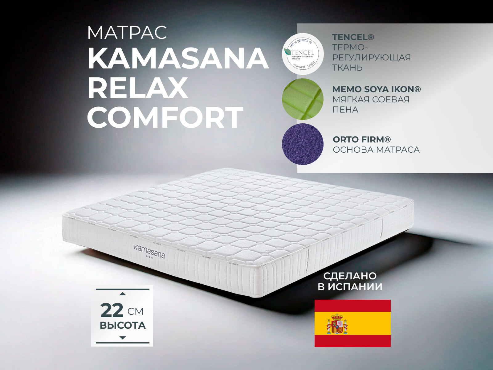 Двухслойная конструкция матраса Relaxcomfort подстраивается под тело человека и обеспечивает оптимальное положение для сна. Верхний слой матрасного блока Memo Soya Ikon с добавлением соевого масла обладает эффектом памяти, отлично дышит и самое главное – обеспечивает высокий анатомический эффект, предотвращает «затекание» и онемение частей тела практически снимая обратное давление на тело человека со стороны матраса. Дополнительно он профилирован с помощью технологии волновой резки, за счёт чего создаётся лёгкий массажный эффект и улучшается воздухообмен. Имеет три анатомических зоны, которые позволяют матрасу выдерживать значительные весовые нагрузки без изменения или деформации самой поверхности матраса. Несущий нижний слой материала основы с высокой компрессионной устойчивостью, в сочетании с верхними мягкими анатомическими слоями, создаёт идеальную поддержку спины с высоким уровнем комфорта. Состав матраса: