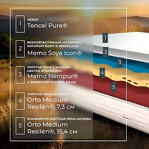Верхний слой блока изготовлен из уникального инновационного материала Memo Neropur с добавлением масла цветков апельсинового дерева (нероли) обладающего эффектом памяти и эластичностью. Свежий апельсиново–медовый аромат Neropur действует как антидепрессант, снимает напряжение и помогает бороться с бессонницей. Дополнительно он профилирован с помощью технологии волновой резки за счёт чего создаётся лёгкий массажный эффект и улучшается воздухообмен. Внутренний блок матраса изготовлен с использованием технологии Ocean Wave, что позволяет максимально адаптироваться пене под физиологические изгибы тела человека, придать правильное положение позвоночнику и расслабить мышечный каркас. Несущие нижние слои блока с высокой компрессионной устойчивостью в сочетании с верхним мягким анатомическим слоем создают идеальную поддержку спины с высоким уровнем комфорта. Матрас изготовлен по идеальной формуле Комфорта, а именно – анатомические верхние слои вязкоэластичного материала с эффектом памяти Memo Neropur и нижние несущие слои ортопедического материала–основы Orto Resilen. Деление блока на анатомические зоны придаёт матрасу оптимальную эргономику и адаптацию матраса в местах значительных весовых нагрузок. Состав матраса: