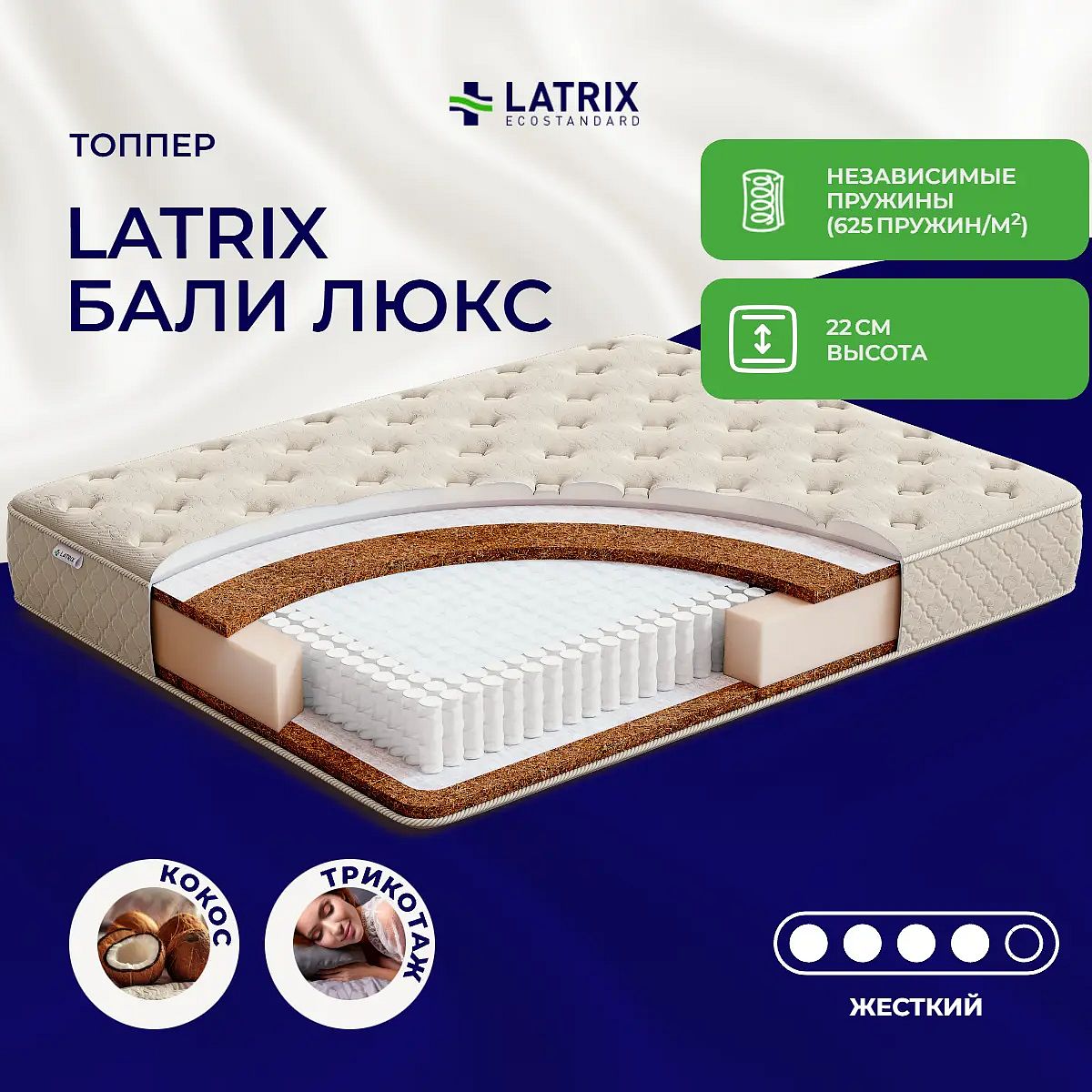 Матрас высокой жесткости «Latrix Бали Люкс» — оптимальный выбор для уверенной поддержки позвоночника. Именно такие модели обычно рекомендуют подросткам, спортсменам или людям с проблемами позвоночника.