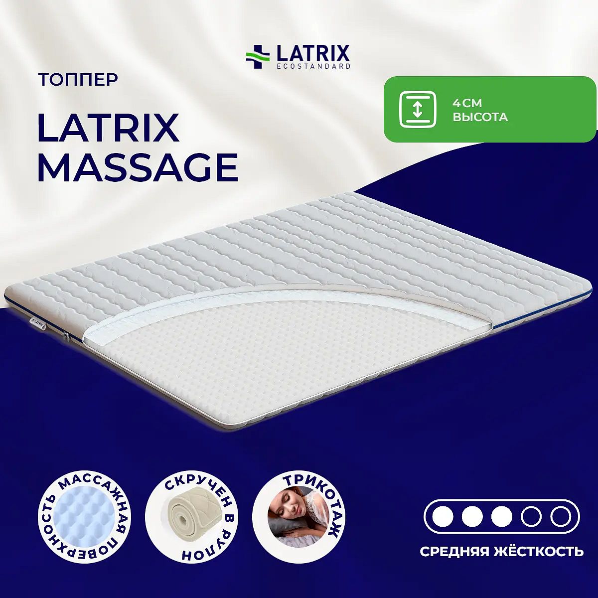 Матрас «Latrix Massage» — средней жесткости, которая подходит большинству людей среднего телосложения. Это — оптимальный вариант и детям, и взрослым, и пожилым людям.