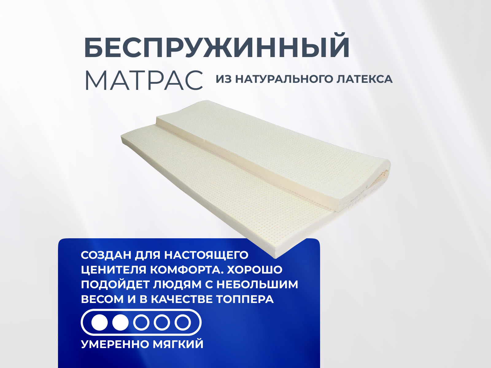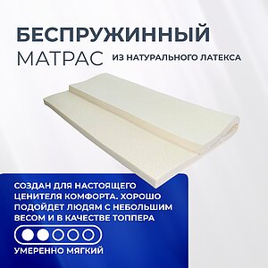 Беспружинный упруго-мягкий тонкий матрас из натурального латекса.Плотность материала: 85 кг/м3. Съемный чехол*: трикотаж. Рекомендуемая нагрузка на спальное место: до 130 кг. Высота: 7,5 см. Тонкий матрас высотой 7,5 см рекомендуется использовать как наматрасника на уже существующий матрас, а также в качестве матраса на диван. Поставляется в скрученном виде. *Матрас поставляется в заводском чехле из ткани "Джерси" белого цвета. За дополнительную плату по желанию можно приобрести чехол из жаккардовой ткани или ткани с содержанием бамбуковых волокон.