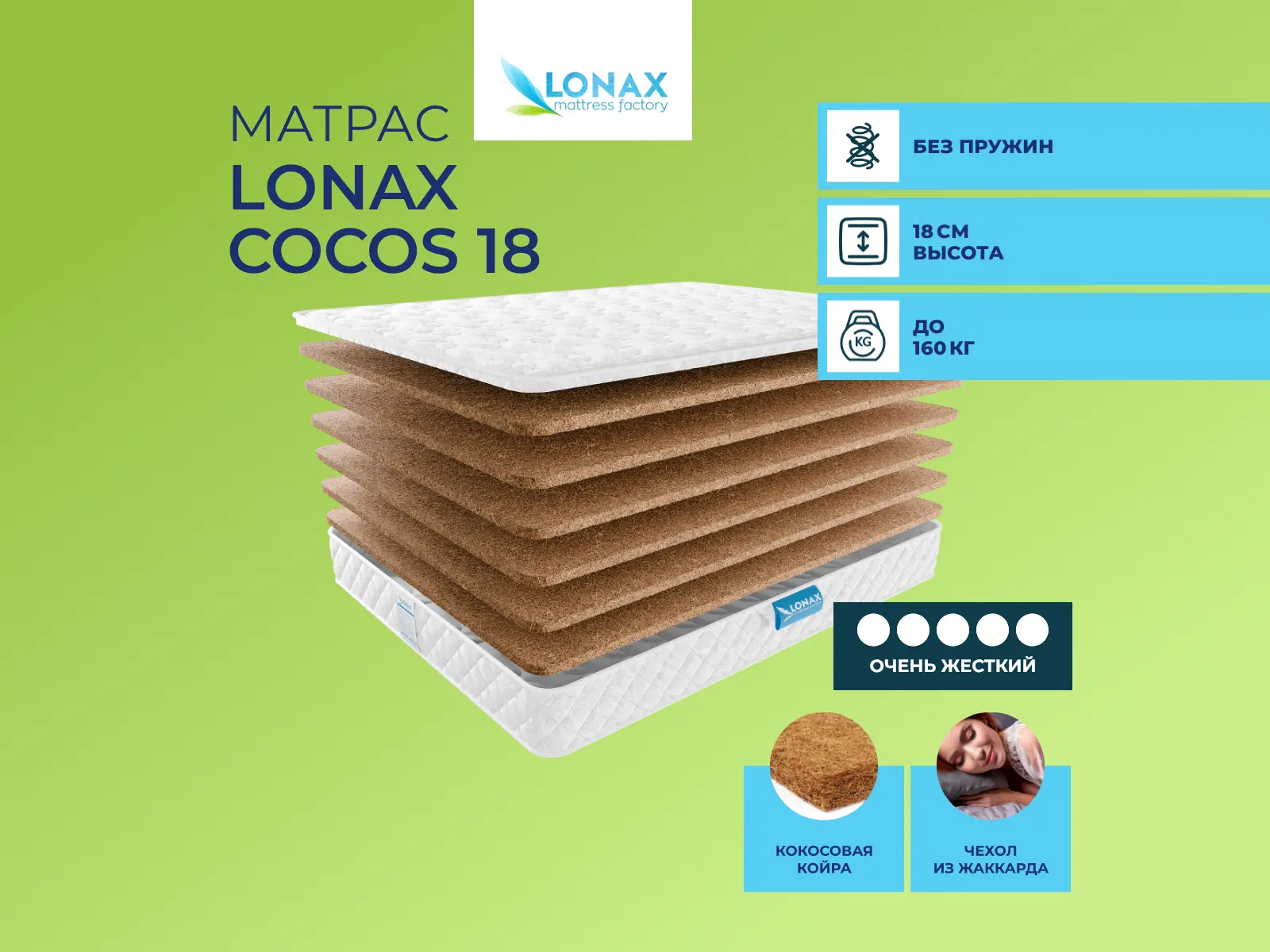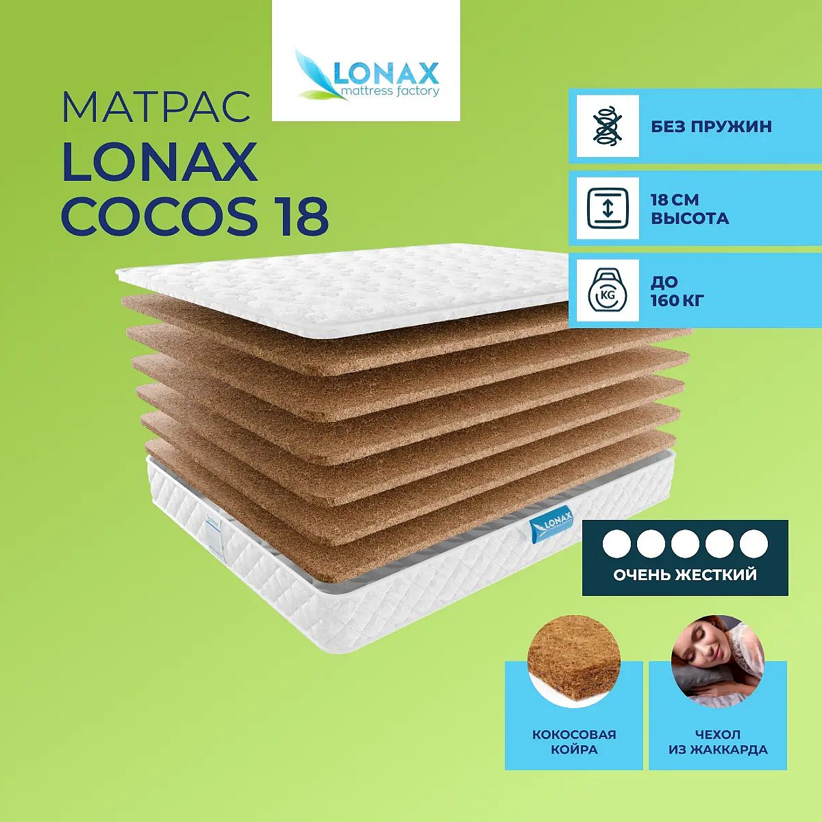 Очень жесткий беспружинный матрас Cocos 18 Lonax из кокосовой койры.Уровень жесткости: высокий. Основа: кокосовая койра (18 см). Чехол: хлопко-вискозный жаккард, простеганный на синтепоне 300 г/м2. Наполнение моделиМодель не имеет пружин, вместо них в матрасе используются 6 слоев кокосовой койры по 3 см каждый. Они образуют поверхность высокой жесткости. На такой поверхности ваш позвоночник получит максимальную поддержку. Она также показана для людей, которые страдают заболеваниями опорно–двигательного аппарата. Кокос гигиеничный и гипоаллергенный материал. Он не вызывает аллергии и не имеет запаха.Чехол из жаккардаЧехол модели изготовлен из прочного хлопкового жаккарда, простеганного на синтепоне.Защита матрасаДля дополнительной защиты поверхности матраса от каких–либо загрязнений, попадания жидкости и образования налета пыли рекомендуем купить также защитный наматрасник–чехол или водонепроницаемый наматрасник.Другие моделиОбратите внимание также на другие жесткие модели: Lonax Cocos 9, Lonax Cocos 15.