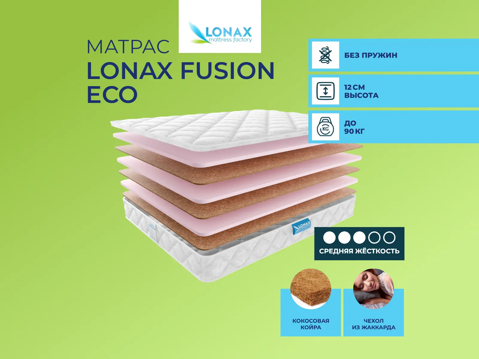 Матрас «Lonax Fusion Eco» — средней жесткости, которая подходит большинству людей среднего телосложения. Это — универсальный вариант и детям, и взрослым, и пожилым людям.