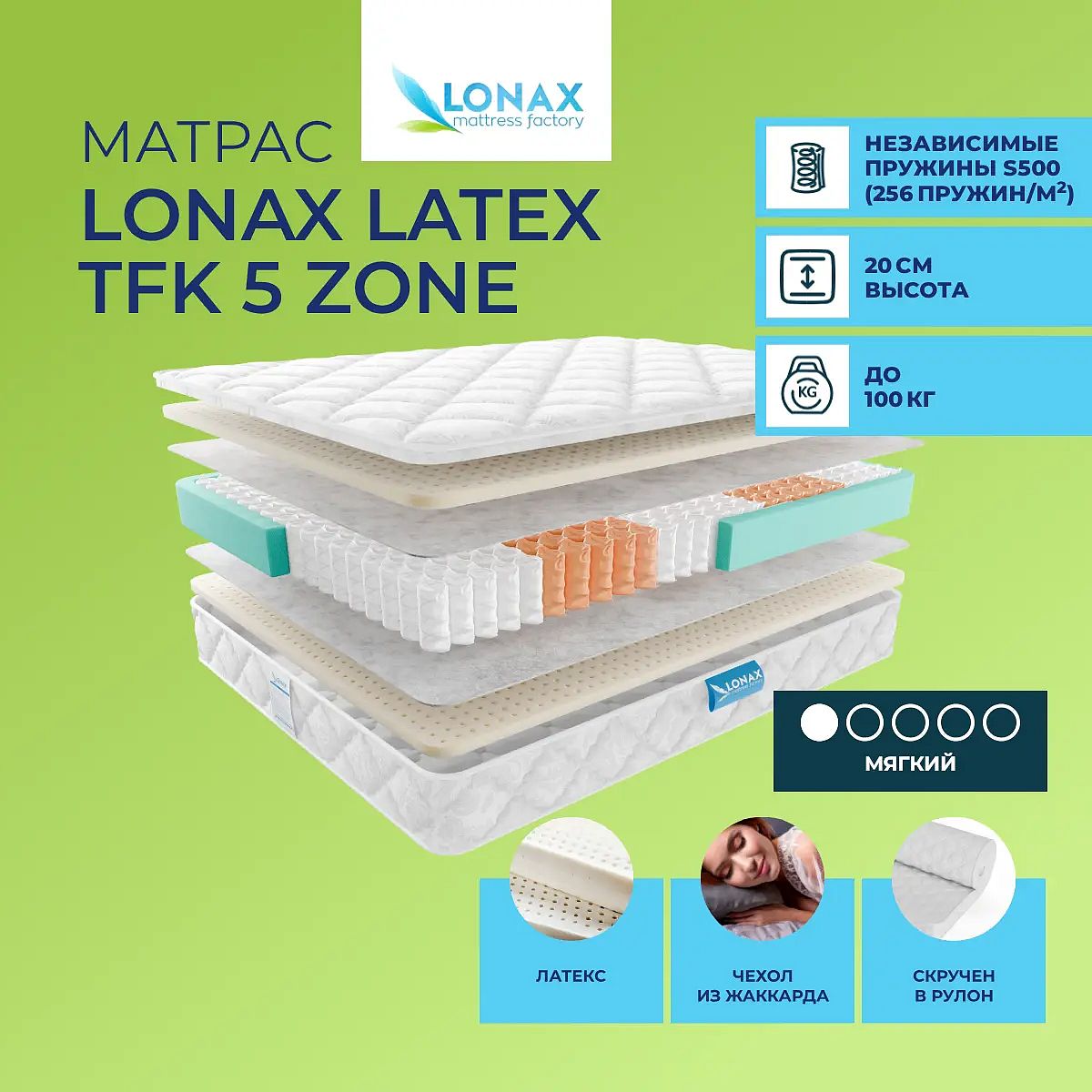 Мягкий матрас «Lonax Latex TFK 5 Zone» отлично подойдет человеку с небольшим весом, предпочитающему высокий уровень комфорта.