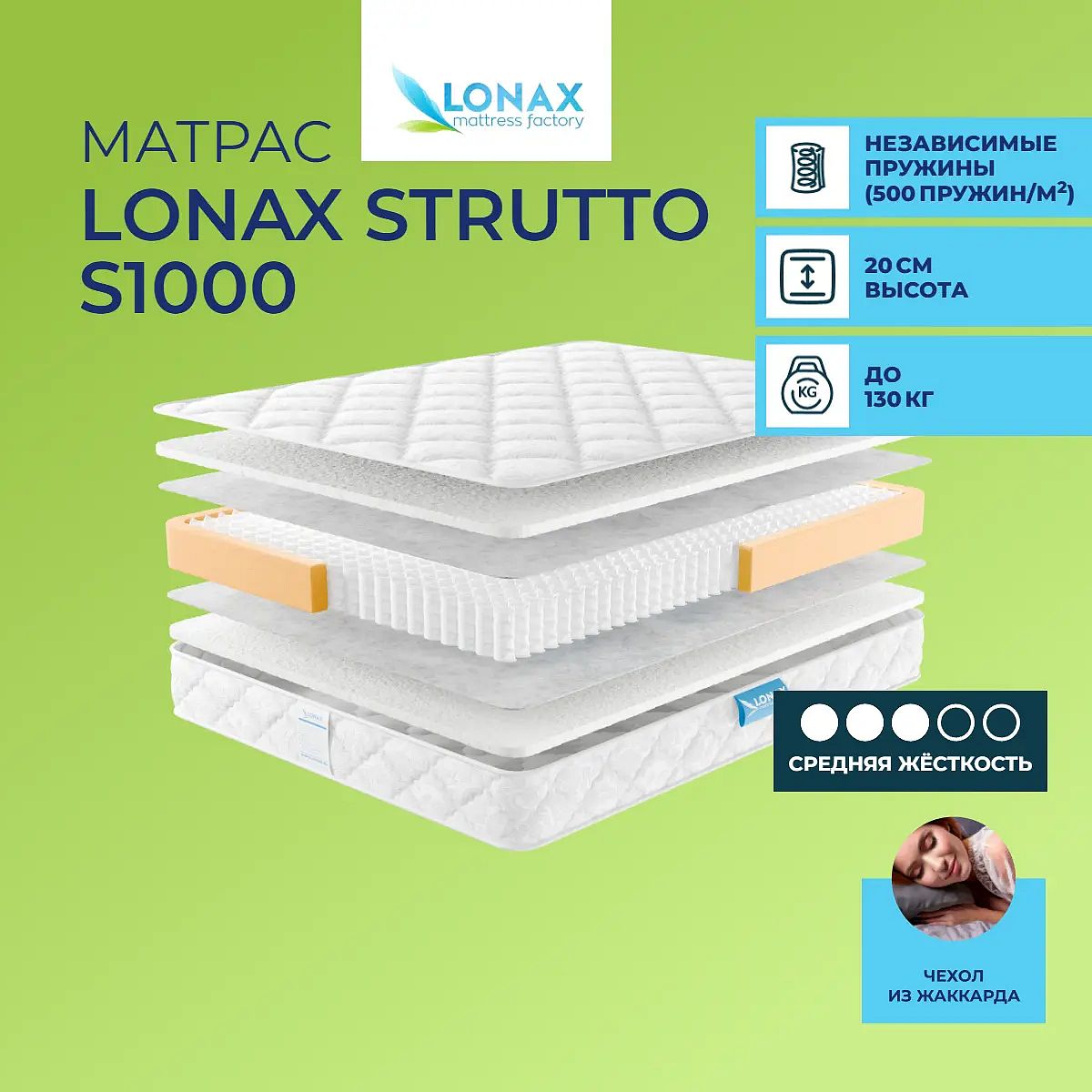 Матрас Strutto Lonax S1000 – это отображение использования новейшего высокотехнологичного материала, работающего для комфорта человека.Уровень жесткости: средний. Состав: