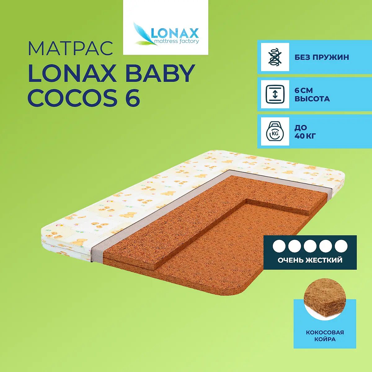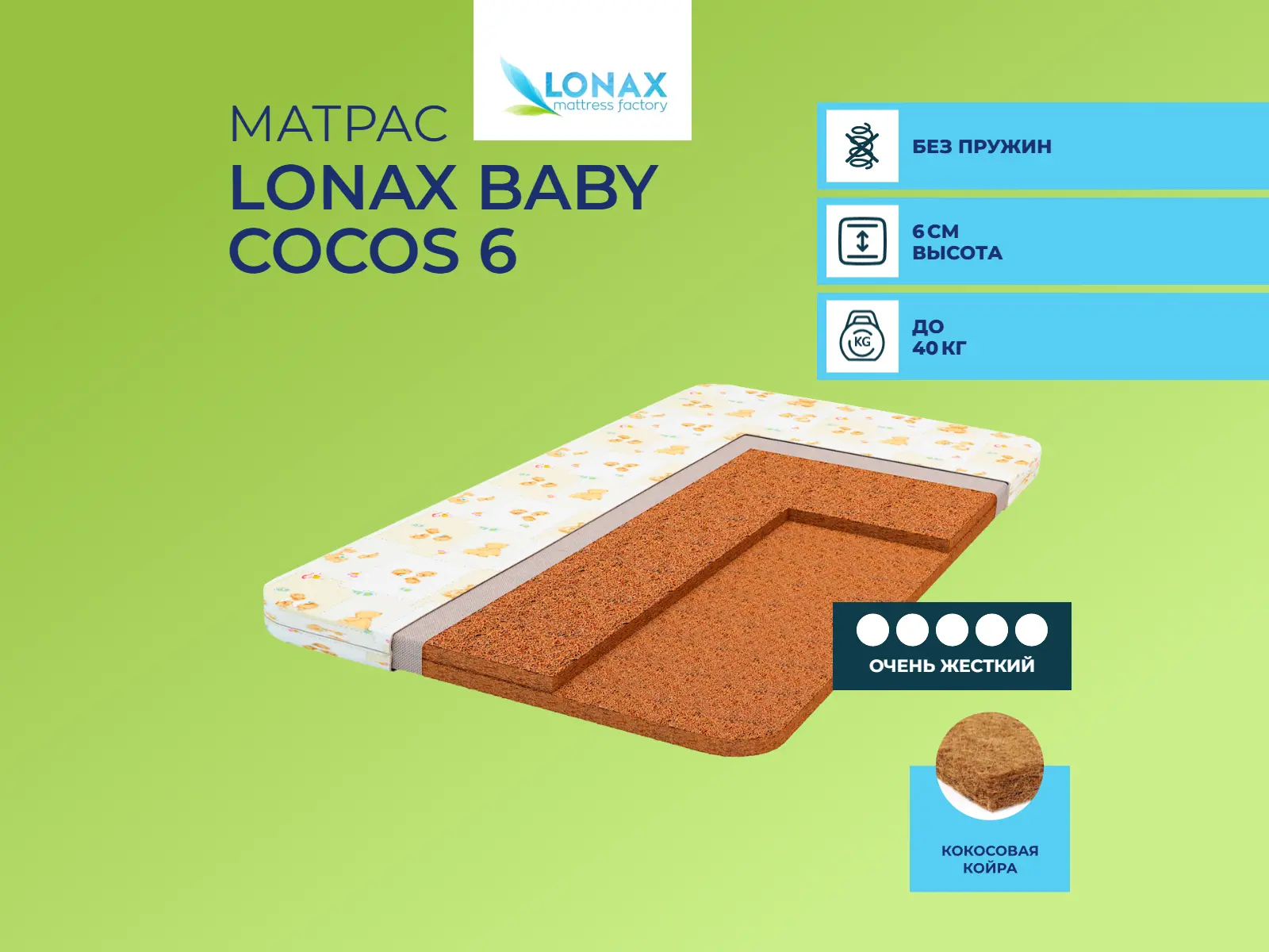 Матрас Baby Cocos 6 Lonax отлично подходит для детей.Уровень жесткости: высокий. Основа: латексированная кокосовая койра – 6 см. Съемный чехол: поликоттон. Наполнение моделиМодель изготавливается на основе двух слоев кокосовой койры. Кокос – это жесткий материал, который получают из волокон околоплодника кокосовой пальмы. Волокна спрессовывают особым образом и пропитывают соком латекса. Это делается для скрепления волокон, а также для придания им эластичности. Благодаря природной жесткости материал способствует правильному положению тела ребенка на поверхности, а также позволяет позвоночнику формироваться правильно. Это полностью гипоаллергенный материал, который не нанесет вред вашему ребенку.Чехол из поликоттонаЧехол модели изготавливается из гипоаллергенного поликоттона.Защита матрасаДля защиты поверхности от пятен от пролитых жидкостей, грязи и пыли рекомендуем купить дополнительно защитный наматрасник–чехол или водонепроницаемый наматрасник.Другие моделиРекомендуем также посмотреть другие детские модели: Lonax Baby Cocos 9, Lonax Baby Latex–Cocos.