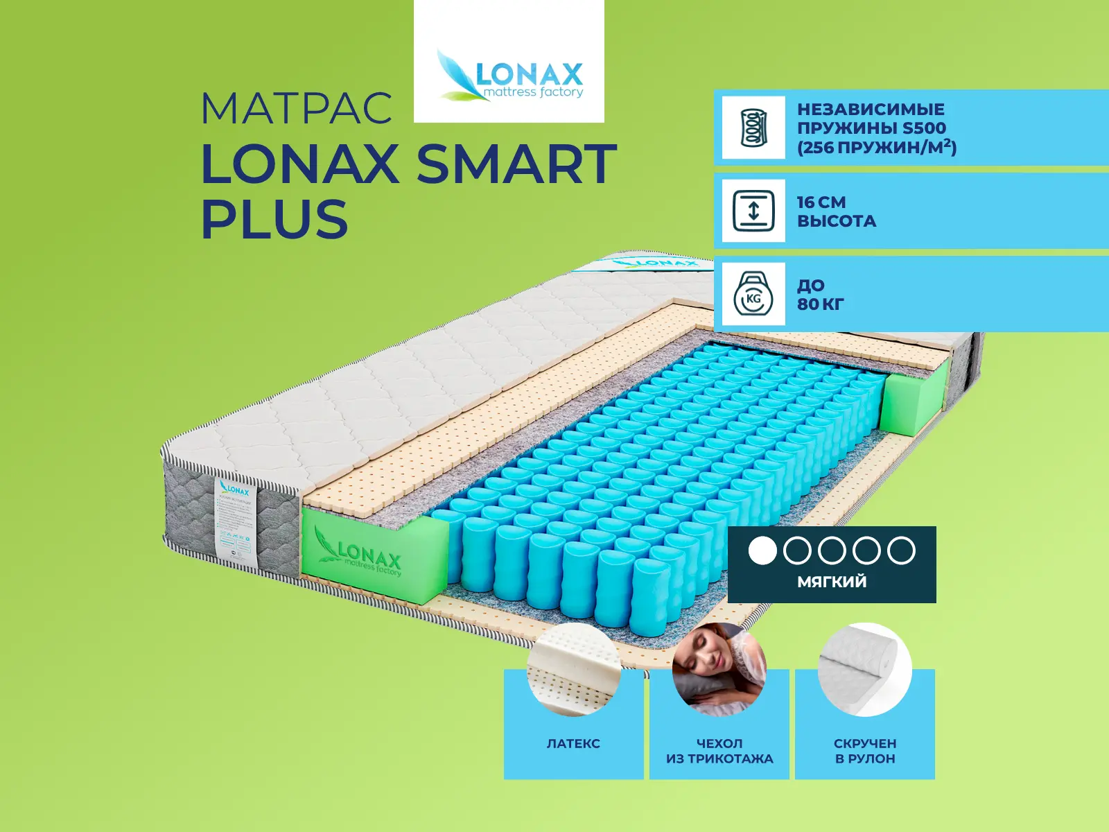 Матрас Lonax Smart Plus создан для любителей мягкого спального ложа.Уровень жесткости: низкий. Состав: