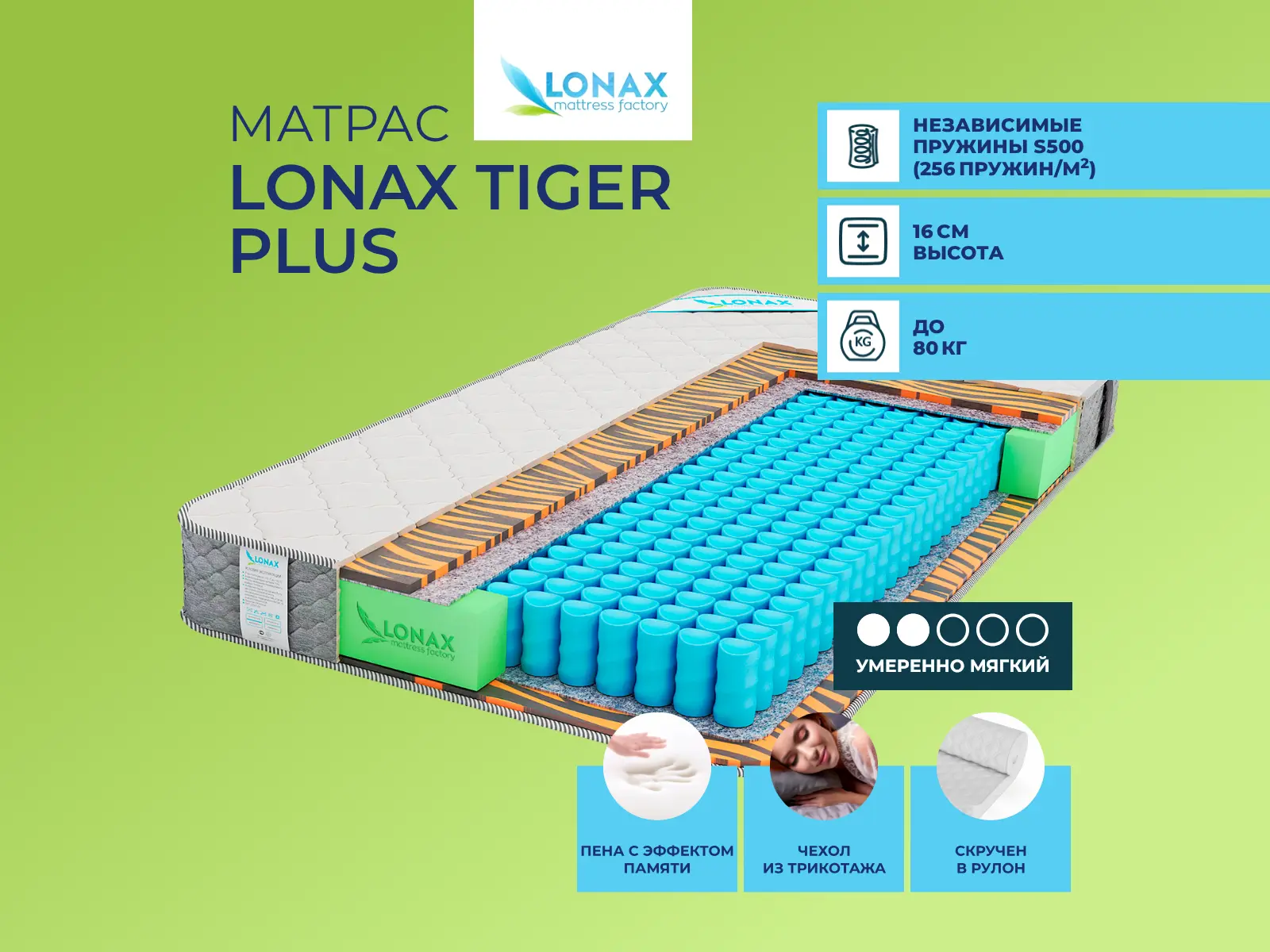 Средне-мягкий матрас «Lonax Tiger Plus» просто создан для настоящего ценителя комфорта. Такой вариант отлично подходит людям с небольшим весом.