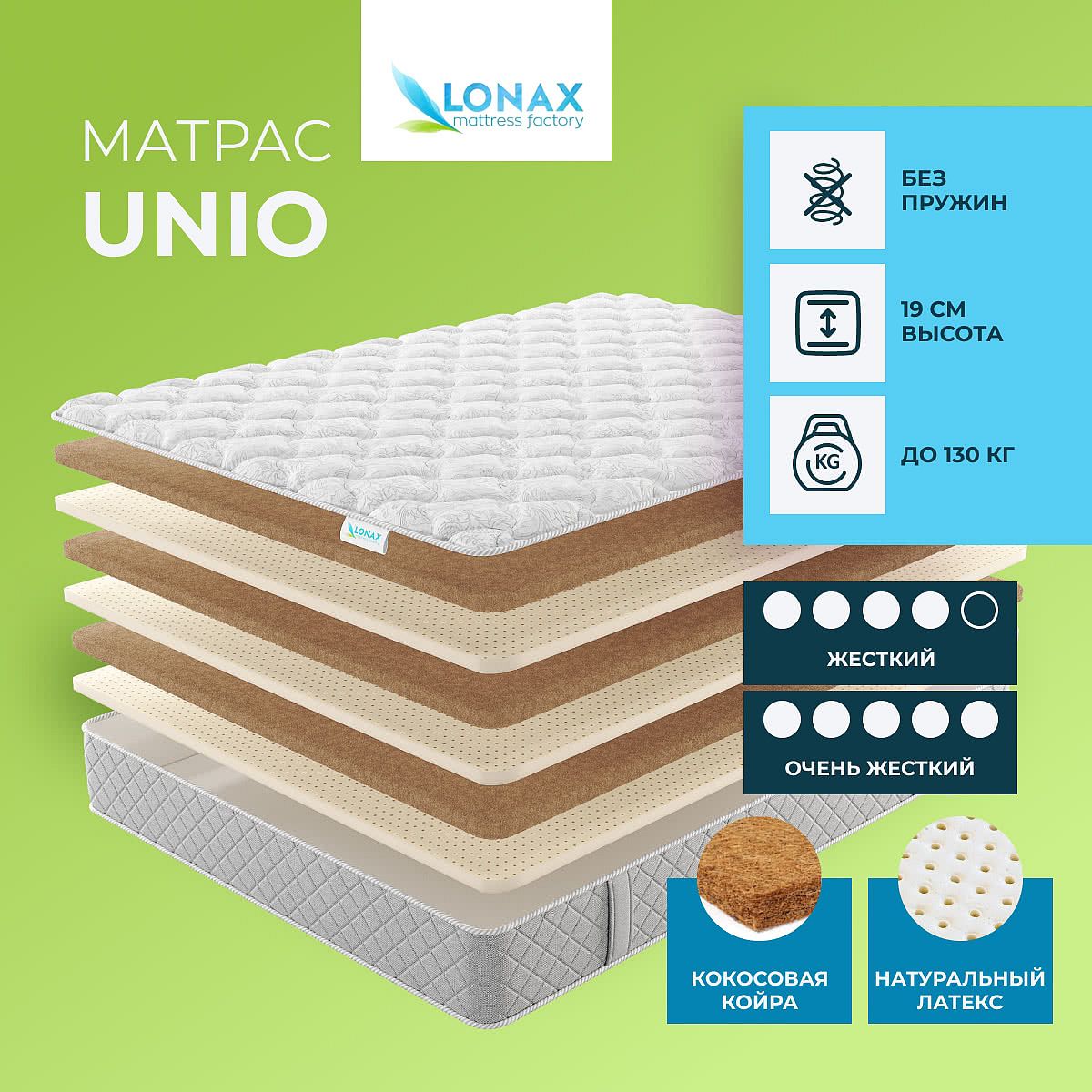 Высота: 19 см. Максимальная нагрузка на одно спальное место: 130 кг. Матрас Unio – беспружинный матрас из чередующихся слоев натурального латекса и кокосовой койры. Такая комбинация наполнителей формирует упругое спальное место с разной жесткостью сторон: жесткое со стороны кокосовой койры и чуть мягче со стороны натурального латекса. В сочетании с трикотажным чехлом, латекс и кокос образуют “дышащую” систему, которая отводит и испаряет избыточную влагу, сохраняет гигиеничность спального места. Матрас Lonax Unio – слоеная основа Ваших крепких снов!