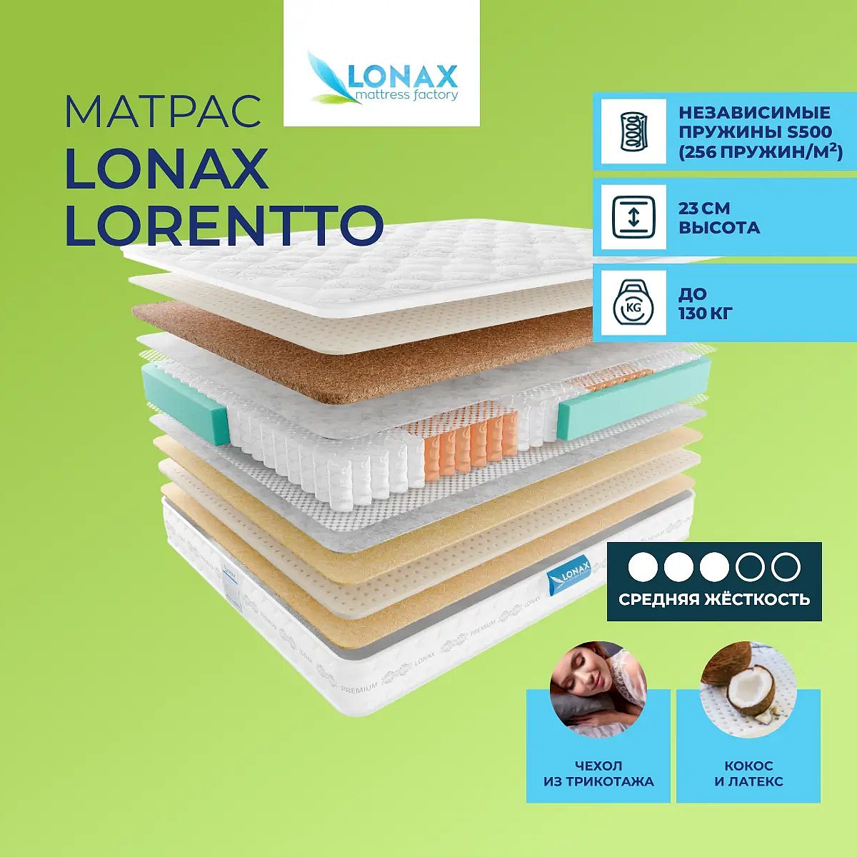 Матрас «Lonax Lorentto» — средней жесткости, которая подходит большинству людей среднего телосложения. Это — универсальный выбор и детям, и взрослым, и пожилым людям.