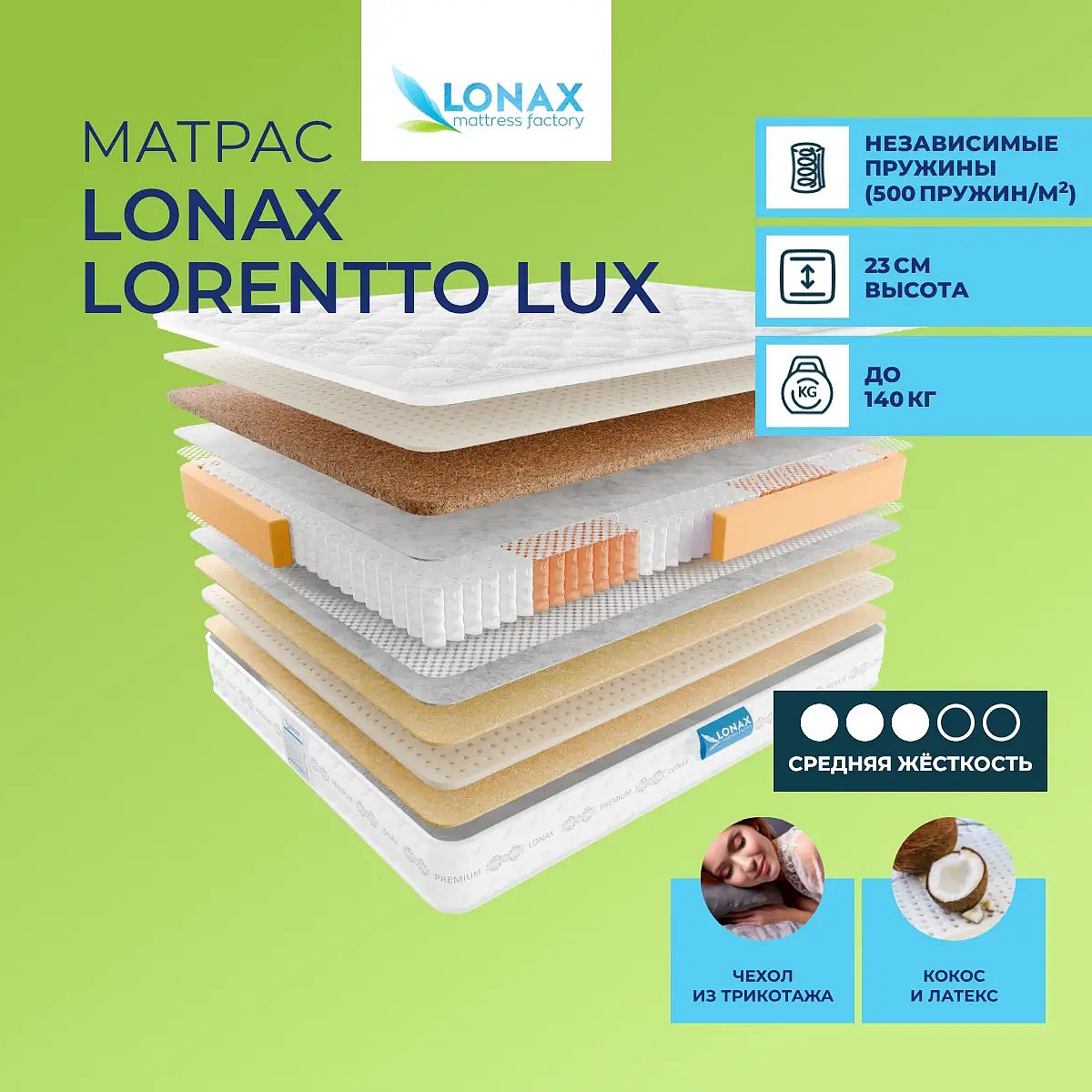 Модель премиум–класса на анатомических пружинах с кокосом, латексом и сизалем. Зональные пружиныОсобенностью модели является блок c зональным распределением пружин – Anatomic Multizone. Все пружины поделены на пять зон и в каждой зоне имеют один размер и одинаковую степень упругости. Пружины помещены в индивидуальные чехлы и точечно воздействуют на тело спящего, причем в каждой зоне из 5 создается свое давление пружин. Тело человека на такой поверхности получает максимальный комфорт и надежную анатомическую основу для позвоночника.Сочетание латекса и кокосаМодель имеет жесткость выше средней. С одной стороны проложены слои натуральной кокосовой койры и латекса. Кокос и латекс отлично взаимодействуют вместе. Кокос наделяет поверхность повышенной жесткостью, а латекс добавляет мягкости и эластичности. Оба материала гипоаллергенные и не имеют запаха.Соединение латекса и волокон сизаляС другой стороны расположены слои сизаля, а между ними проложен слой натурального латекса. Жесткие волокна сизаля создают оптимальный микроклимат на поверхности. Благодаря тому, что они сухие с их поверхности влага испаряется быстро, поэтомя полностью исключается образование вредных микроорганизмов на спальной поверхности.Вентиляция в матрасеМодель оборудована системой перфорации верхних слоев матраса по высоте латексного слоя.Трикотажный чехолЧехол модели изготавливается из трикотажной ткани «Джаст» со специальными волокнами и имеет дизайнерское решение.Защита матрасаДля того, чтобы предотвратить появление нежелательных пятен, мокрых разводов, а также попадания пыли на спальную поверхность рекомендуем купить защитный наматрасник–чехол или водонепроницаемый наматрасник.Другие моделиПосмотрите также другие модели этой серии: Lonax Exellent Lux и Lonax Lorentto.