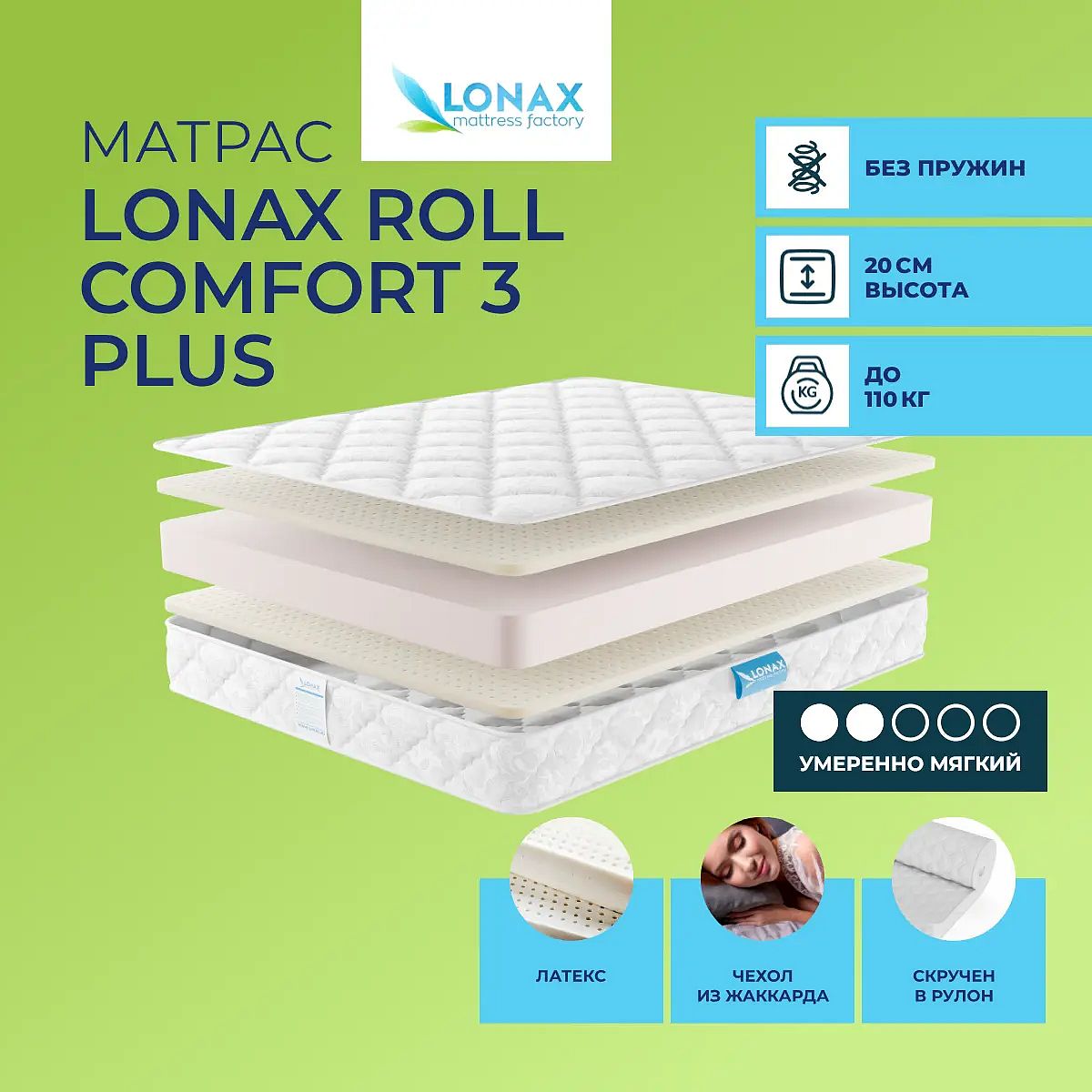 Средне-мягкий матрас «Lonax Roll Comfort 3 Plus» просто создан для настоящего ценителя комфорта. Такая модель хорошо подойдет людям с небольшим весом.