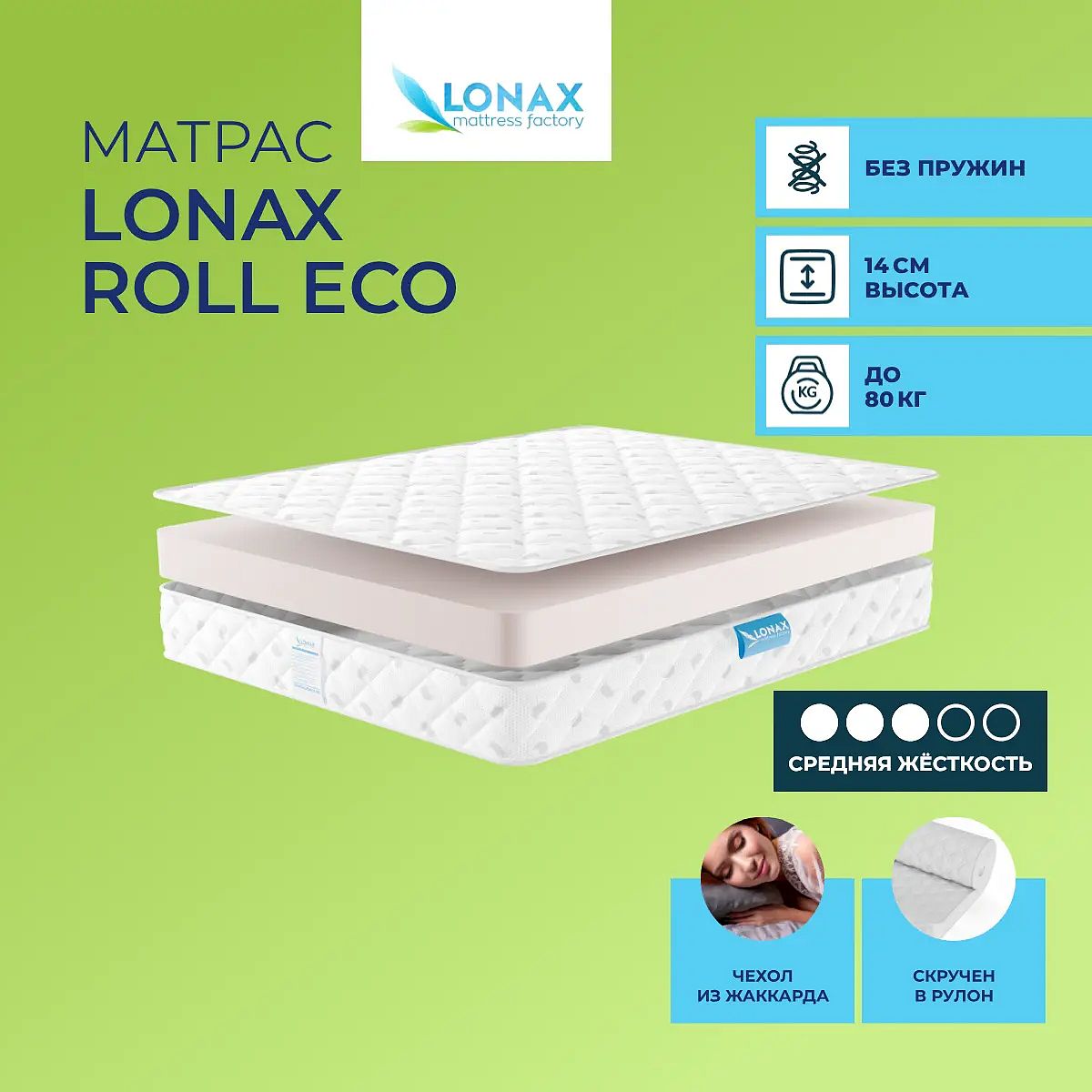 Матрас «Lonax Roll Eco» — средней жесткости, которая подходит большинству людей среднего телосложения. Это — универсальный выбор и детям, и взрослым, и пожилым людям.