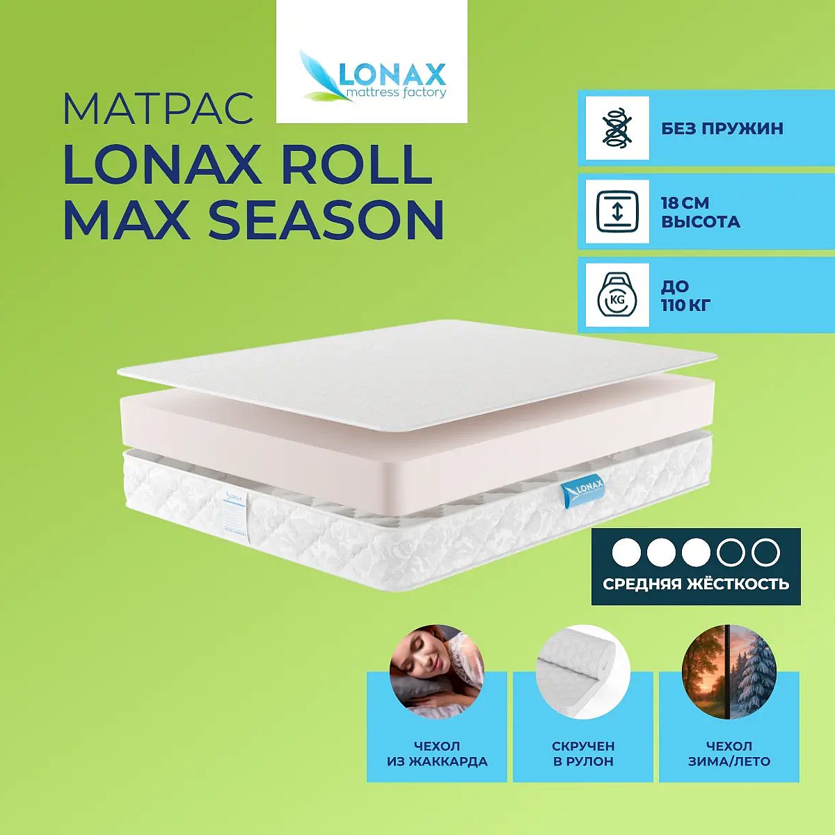 Матрас «Lonax Roll Max Season» — средней жесткости, которая комфортна большинству людей среднего телосложения. Это — универсальный вариант и детям, и взрослым, и пожилым людям.