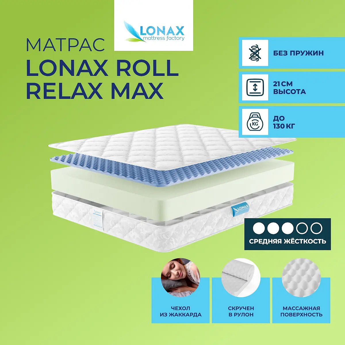 Матрас «Lonax Roll Relax Max» — средней жесткости, которая подходит большинству людей среднего телосложения. Это — оптимальный вариант и детям, и взрослым, и пожилым людям.