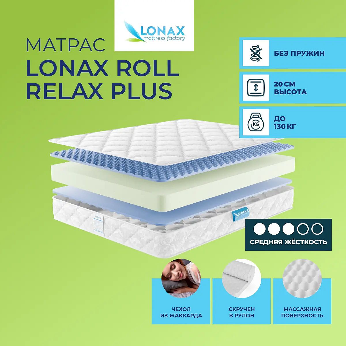 Матрас «Lonax Roll Relax Plus» — средней жесткости, которая подходит большинству людей среднего телосложения. Это — оптимальный вариант и детям, и взрослым, и пожилым людям.