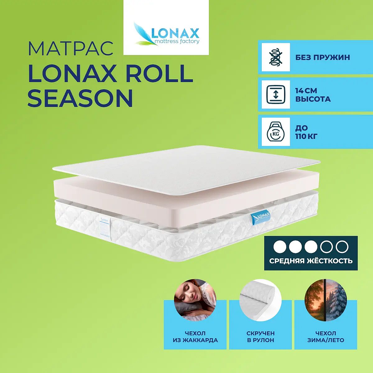 Матрас «Lonax Roll Season» — средней жесткости, которая подходит большинству людей среднего телосложения. Это — универсальный выбор и детям, и взрослым, и пожилым людям.
