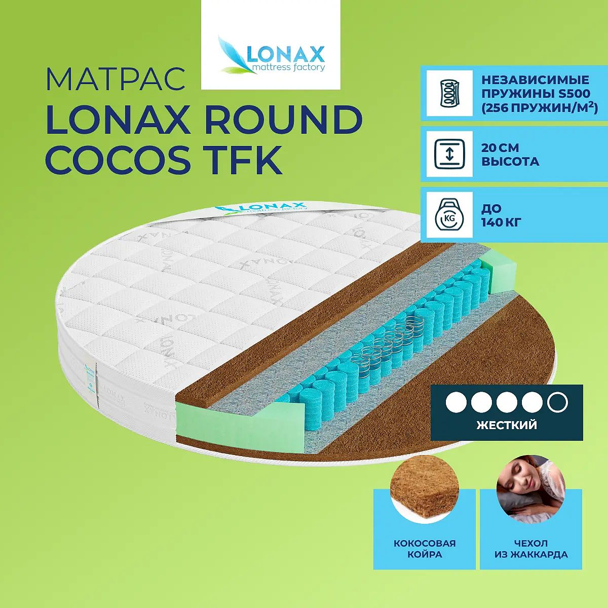 Матрас Round Cocos Lonax TFK для тех, кто любит спать на жесткой поверхности.Уровень жесткости: высокий. Состав: