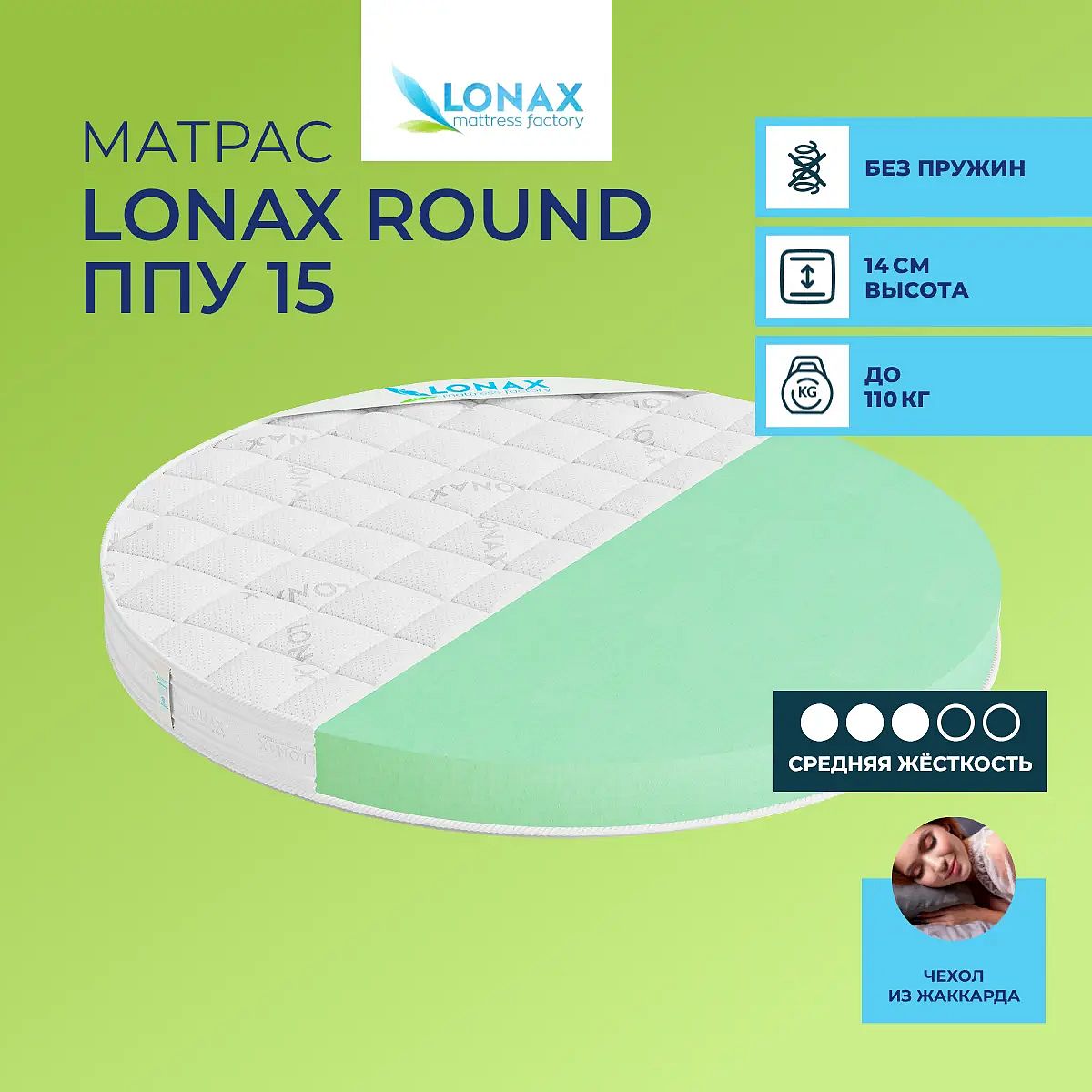 Матрас Round ППУ Lonax 15 на основе современного искусственного материала надолго сохранит свои свойства.Уровень жесткости: средний. Состав: