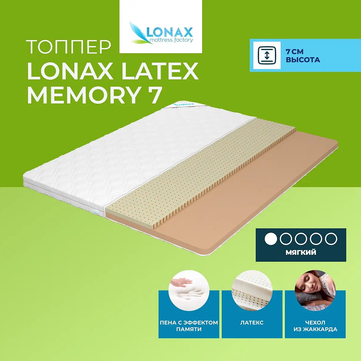 Тонкий матрас-топпер Lonax Latex Memory 7 создан для комфортного сна и мягкой поддержки. Он подходит для тех, кто ценит деликатные ощущения и желает повысить удобство обычного матраса или дивана. Благодаря сочетанию натурального латекса и пены с эффектом памяти топпер обеспечивает приятную упругость и адаптацию к контурам тела, помогая расслабиться после насыщенного дня. Высота топпера составляет 7 см. Одна сторона выполнена из натурального латекса (3 см) — материала, который мягко поддерживает и смягчает поверхность. Вторая сторона — из мемориформ (4 см), который подстраивается под форму тела, снижая давление и повышая качество отдыха. Чехол из хлопкового жаккарда прочен, приятен на ощупь и сохраняет аккуратный внешний вид. Характеристики