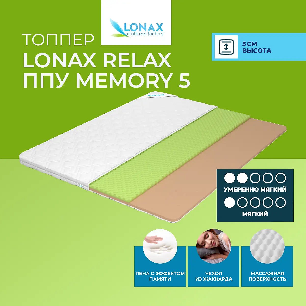 Тонкий матрас-топпер Lonax Relax ППУ Memory 5 — это универсальное решение для обновления спального места и повышения комфорта сна. Благодаря сочетанию современных материалов топпер обеспечивает мягкую и расслабляющую поддержку, а две разные стороны позволяют выбрать наиболее приятные ощущения для сна. С одной стороны используется ППУ с массажным эффектом (3 см) — материал с ячеистой нарезкой мягко массирует тело, снимает напряжение и способствует вентиляции. Другая сторона выполнена из слоя мемориформ (2 см), который подстраивается под контуры тела и создает ощущение невесомости. Свойства и характеристики