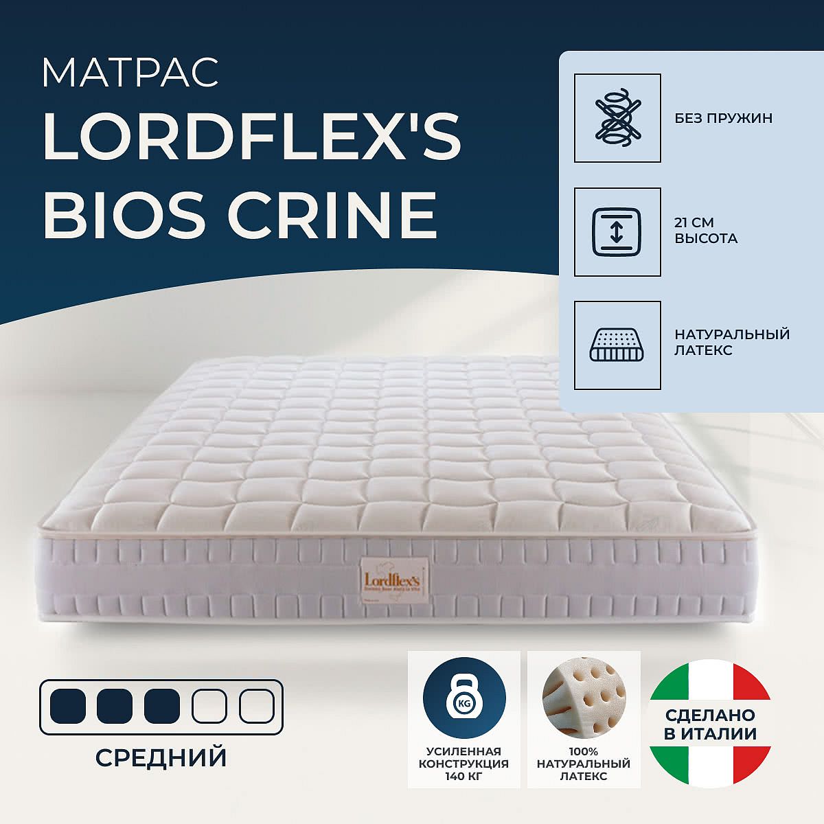 Матрас «Lordflex's Bios crine» — средней жесткости, которая подходит большинству людей среднего телосложения. Это — универсальный выбор и детям, и взрослым, и пожилым людям.