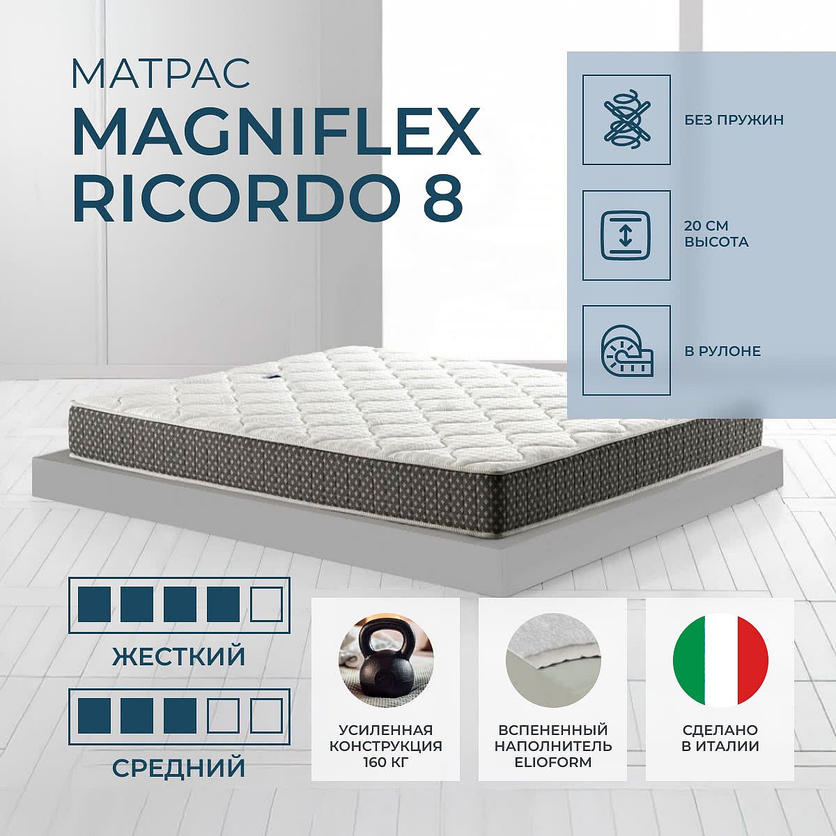Матрас Ricordo 8 выполнен из прочных материалов, за счет чего выдержит значительные нагрузки.