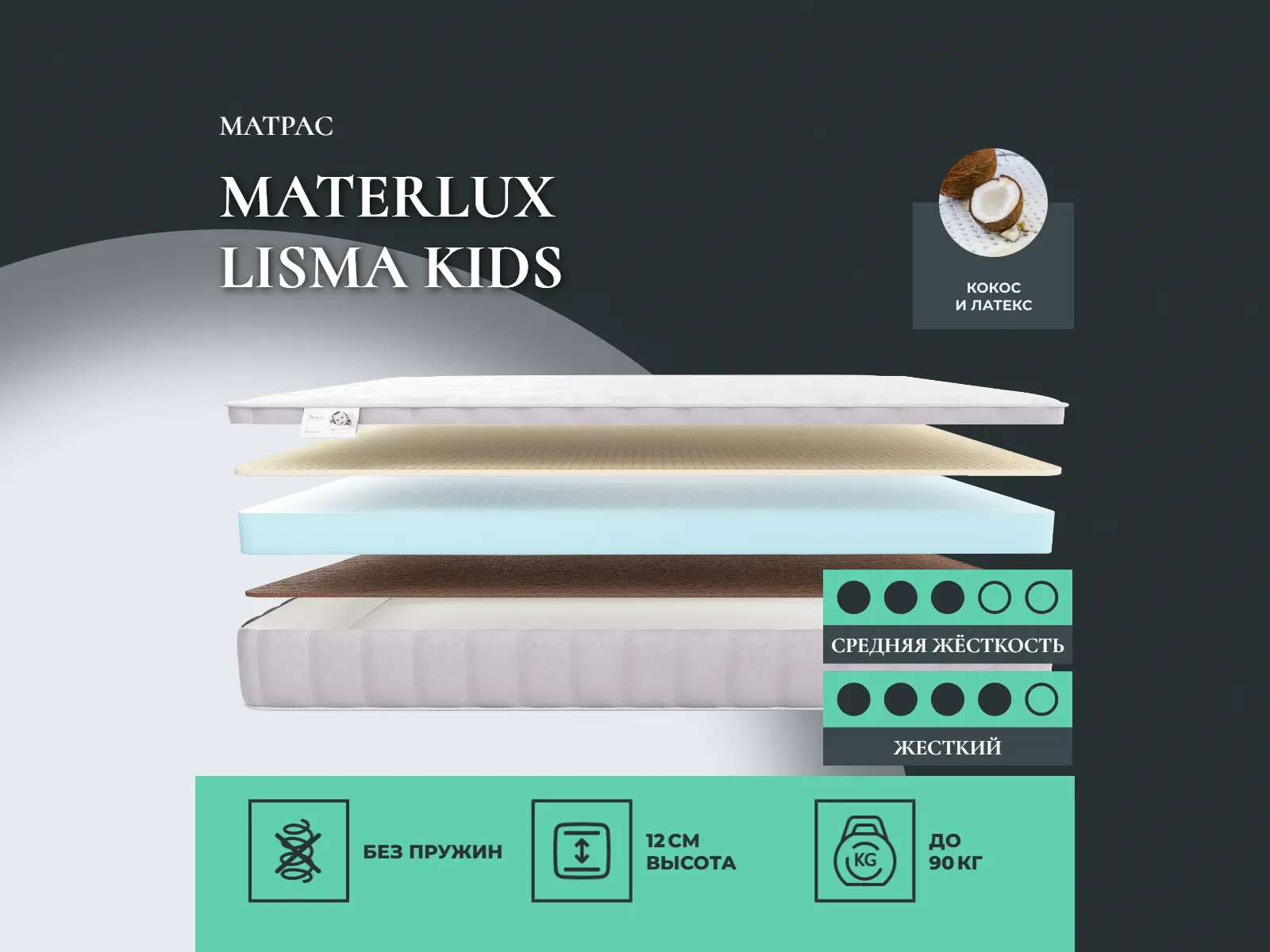 Кокос — натуральный материал, койра отлично дышит, придает матрасу «Lisma Kids» жесткость и упругость.