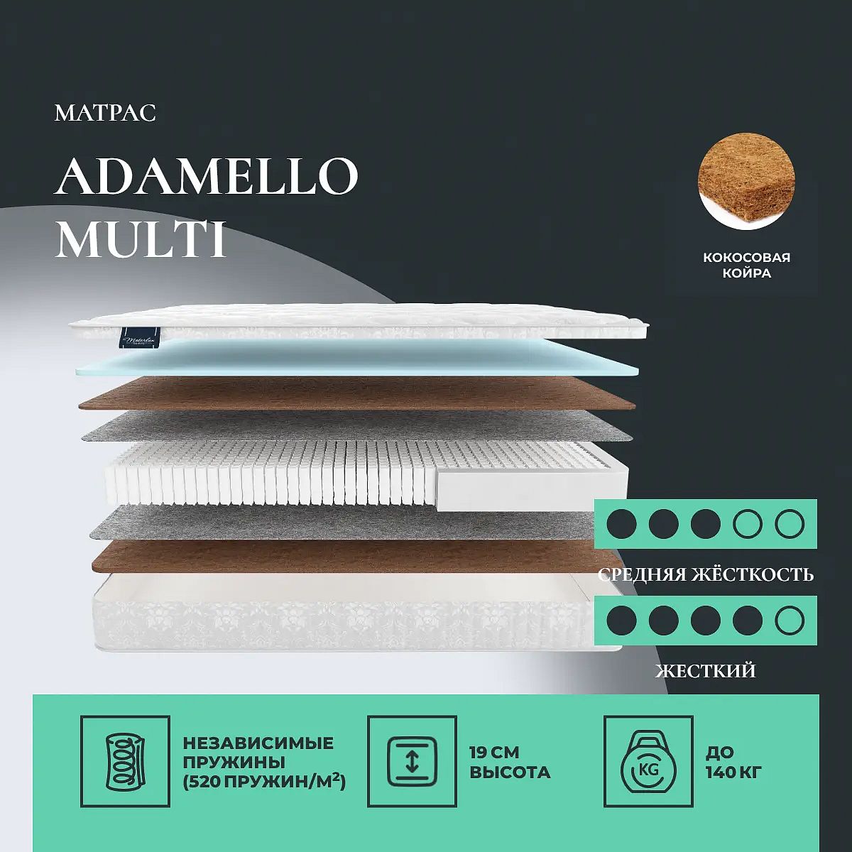 Кокос — натуральный материал, койра отлично дышит, придает матрасу «Adamello Multi» жесткость и упругость.