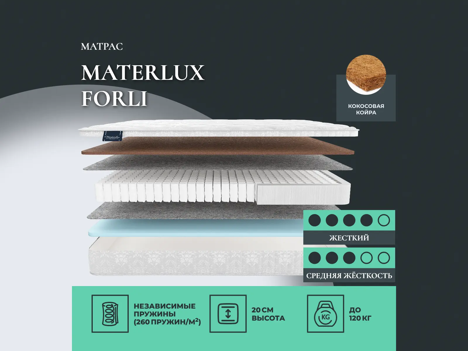 Кокос — натуральный материал, койра отлично дышит, придает матрасу «Forli» жесткость и упругость.