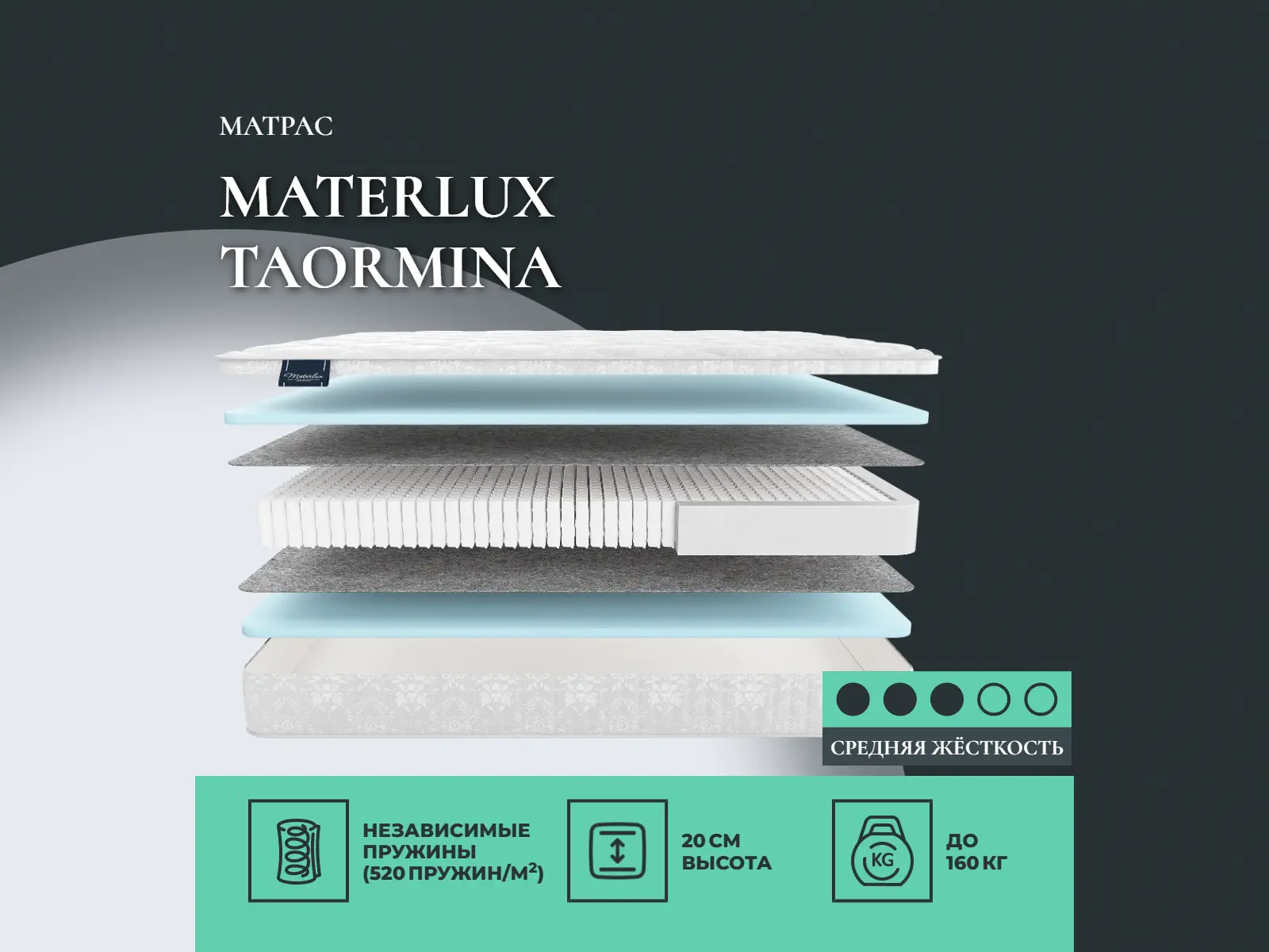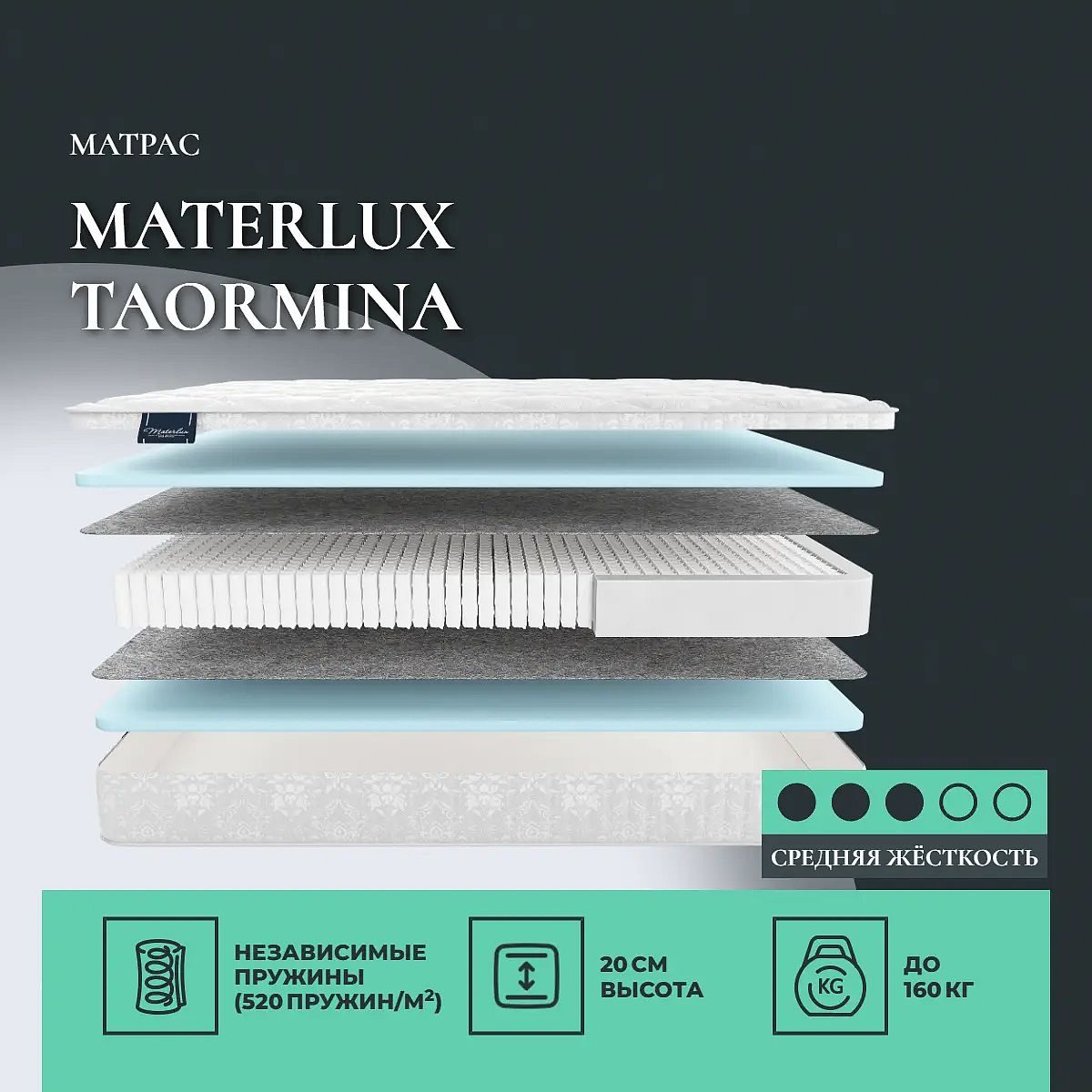 Матрас «Materlux Taormina» — средней жесткости, которая комфортна большинству людей среднего телосложения. Это — оптимальный выбор и детям, и взрослым, и пожилым людям.