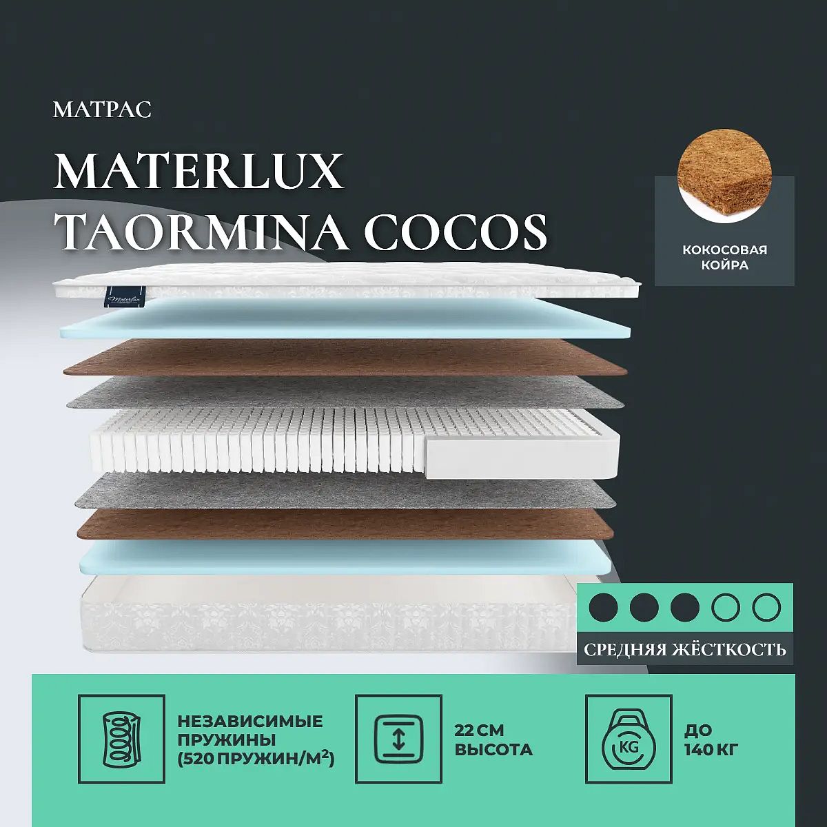 Матрас «Materlux Taormina Cocos» — средней жесткости, которая комфортна большинству людей среднего телосложения. Это — универсальный вариант и детям, и взрослым, и пожилым людям.