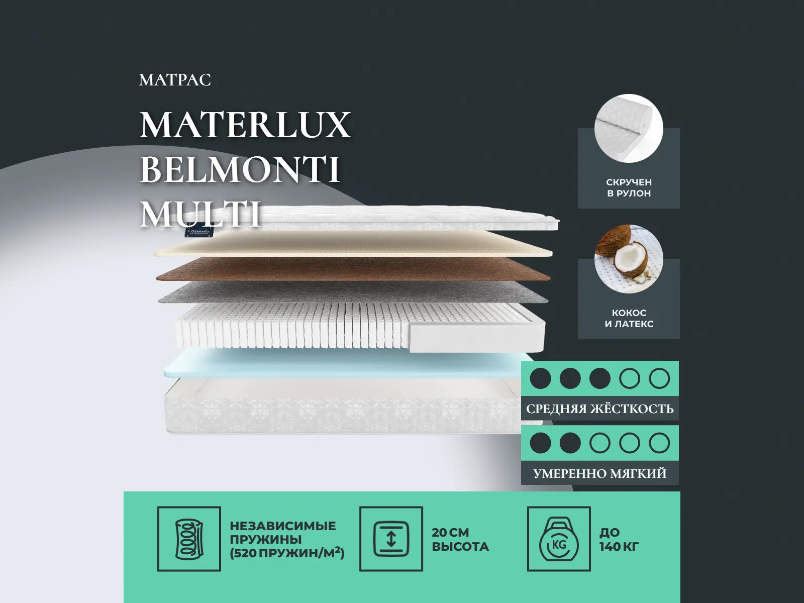Кокос — натуральный материал, койра отлично дышит, придает матрасу «Belmonti Multi» жесткость и упругость.