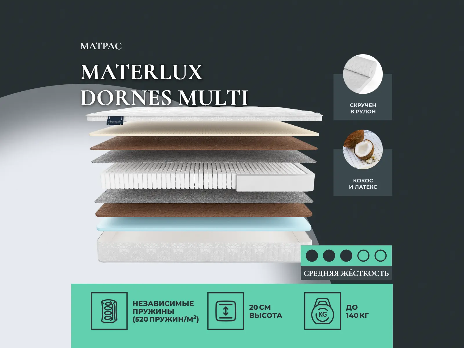 Матрас «Materlux Dornes Multi» — средней жесткости, которая комфортна большинству людей среднего телосложения. Это — оптимальный выбор и детям, и взрослым, и пожилым людям.