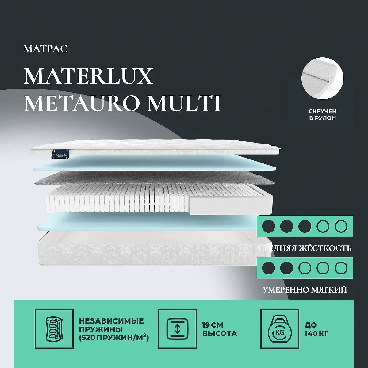 Матрас Metauro Multi может доставляться как в полноразмерном виде, так и в скрученном. Данный матрас можно свернуть на фабрике в компактный рулон. Скрученный матрас удобно перевезти на дачу или просто забрать из магазина. Свернуть матрас повторно так же компактно в домашних условиях невозможно.