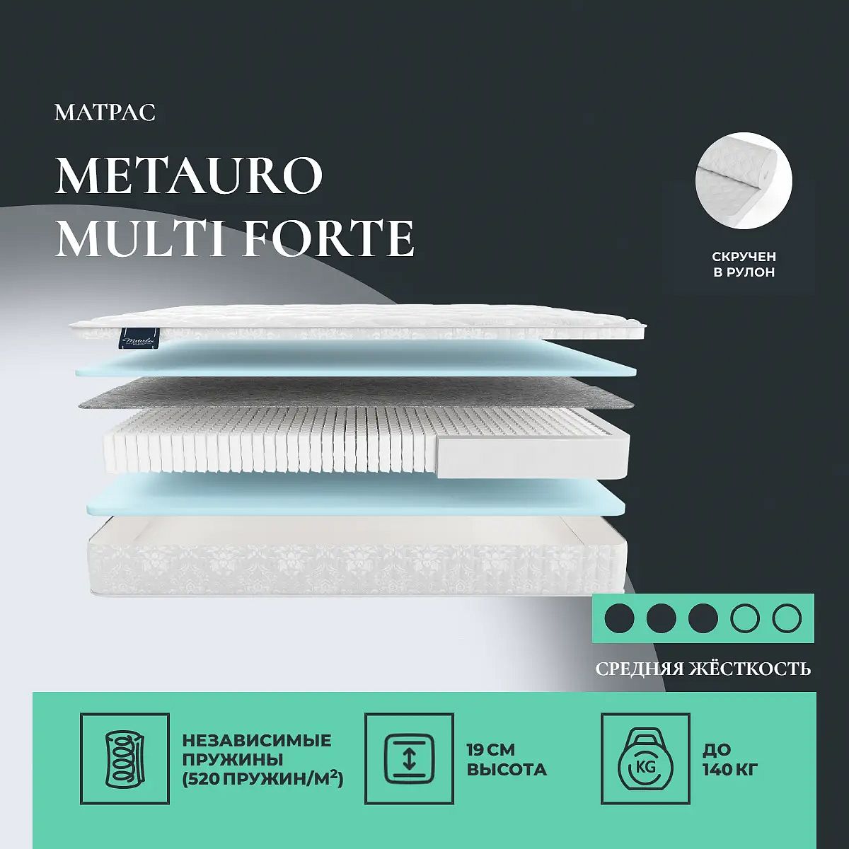 Матрас Metauro Multi Forte может доставляться как в полноразмерном виде, так и в скрученном. Данный матрас можно свернуть на фабрике в плотный рулон. Скрученный матрас удобно перевезти на дачу или просто забрать из магазина. Свернуть матрас повторно так же компактно в домашних условиях невозможно.