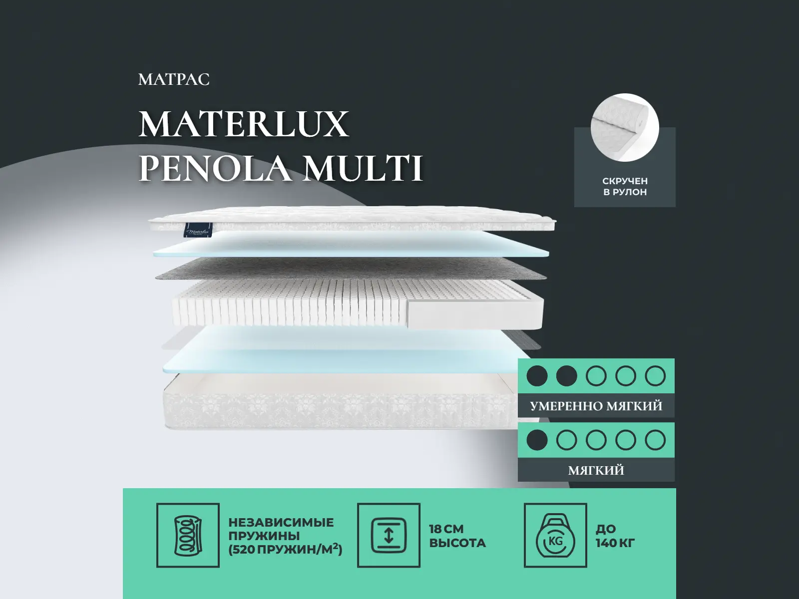 Матрас Penola Multi может доставляться как в полноразмерном виде, так и в скрученном. Данный матрас можно свернуть на фабрике в плотный рулон. Скрученный матрас удобно перевезти на дачу или просто забрать из магазина. Свернуть матрас повторно так же компактно в домашних условиях невозможно.